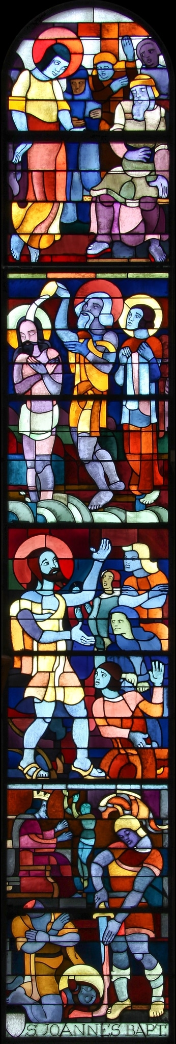Ce vitrail se compose de quatre scènes relatant différents épisodes de la vie de saint Jean-Baptiste, avec, de haut en bas :