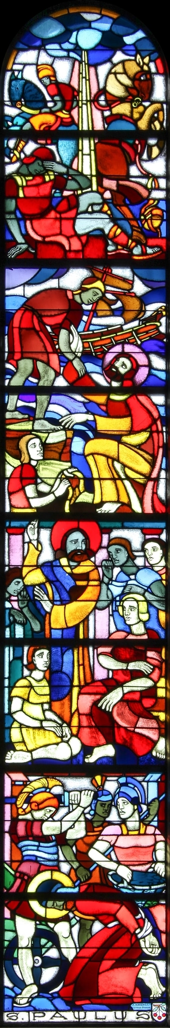 Ce vitrail se compose de quatre scènes relatant différents épisodes de la vie de saint Paul, avec, de haut en bas :