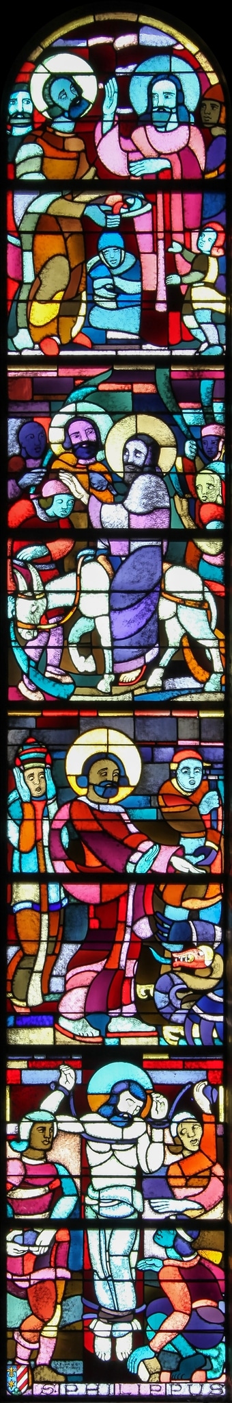 Ce vitrail se compose de quatre scènes relatant différents épisodes de la vie de saint Philippe, avec de haut en bas :