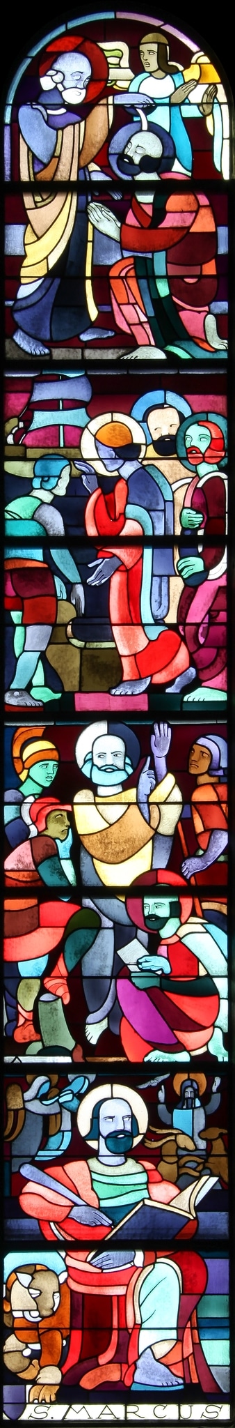 Ce vitrail se compose de quatre scènes relatant différents épisodes de la vie de saint Marc, avec, de haut en bas :