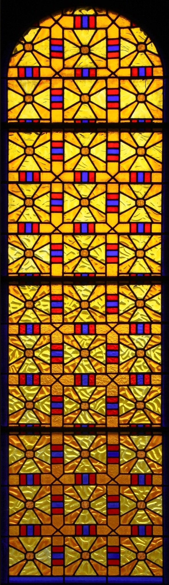 Faisant la part belle aux tons jaunes, ces vitraux présentent des motifs quasiment identiques, à la différence que les deux du choeur possèdent dans leur centre une croix en verre blanc. N’étant pratiquement pas visibles depuis la nef, il était plus cohérent d’opter pour des vitraux ornementaux, ceux-ci étant bien moins onéreux que les vitraux figurés. Comme c’est souvent le cas à l’époque lors de la réalisation de verrières ornementales, l’atelier a opté pour des verres à reliefs, ici en particulier des verres dits “chenillés”, plus épais et retenant par conséquent plus la lumière que des verres simples, permettant d’éviter une arrivée lumineuse trop forte dans les chapelles. Ils contribuent à créer une atmosphère chaude en harmonie avec les teintes imaginées par Dumas et Landry. Cette lumière dorée fait écho aux rameaux or qui parsèment la voûte du choeur, de même qu’à la richesse des panneaux du retable et de l’orfèvrerie de l’autel.