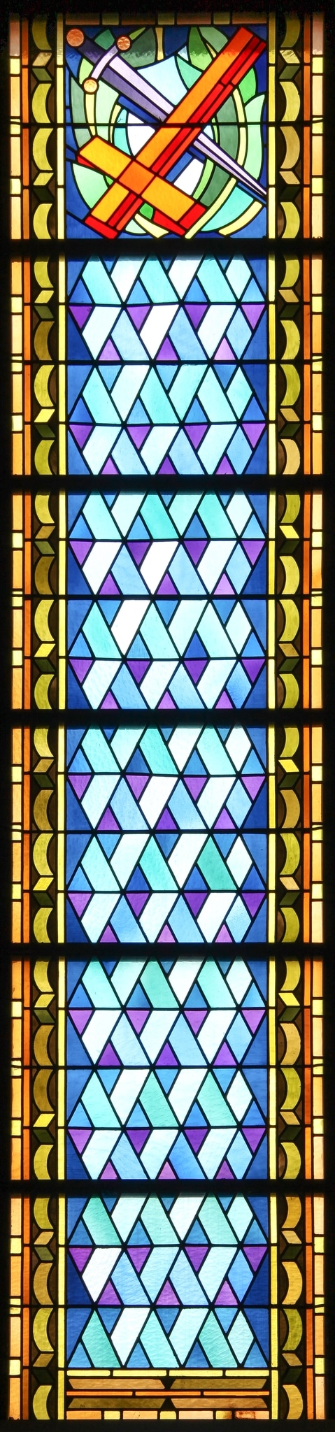 Il apparaît clairement que les vitraux n’ont pas été l’élément principal de la décoration de l’église, contrairement à la céramique, traitée à la manière de la mosaïque, que l’on retrouve partout dans l’édifice. Bien qu’il s’agisse d’un choix esthétique délibéré, nous pouvons tout de même nous demander si c’est aussi par manque de moyens financiers que des vitraux géométriques (bien moins chers que des vitraux narratifs), ont été choisis.
