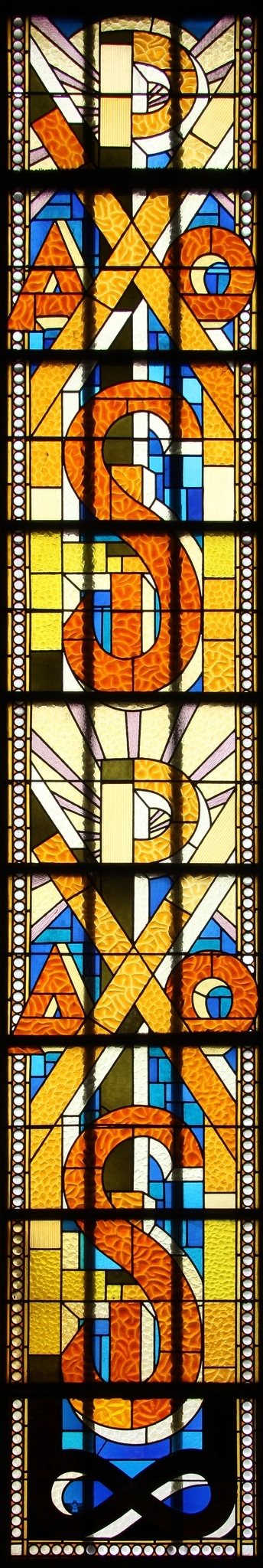 Plusieurs symboles chrétiens se superposent en se répétant à deux reprises avec de haut en bas : le Chrisme (monogramme du Christ) accompagné de l’alpha et l’oméga au-dessus du symbole “IHS” (Jésus) dont les lettres sont imbriquées les unes dans les autres. Ce motif se répète dans la partie inférieure, accompagné, tout en bas du vitrail, du symbole de l’infini. Le tout se détache sur un fond présentant différents motifs géométriques, avec une fine bordure composée de petits cabochons circulaires superposés transparents.