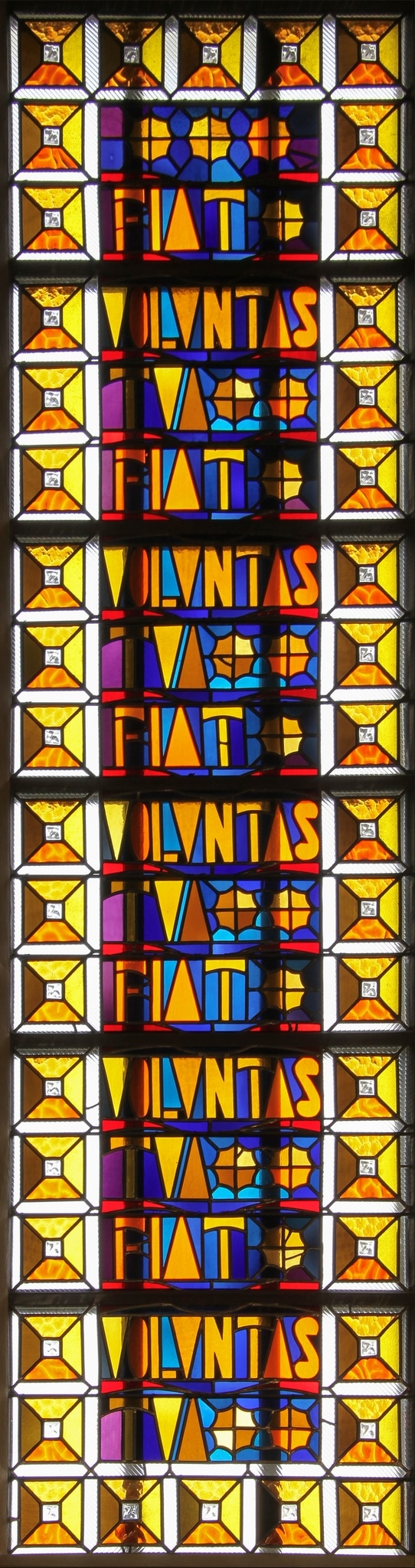 Un extrait du “Notre Père” en latin, “Fiat voluntas tuas” (que ta volonté soit faite) en lettres stylisées, traitées dans des couleurs allant de l’orange au jaune en passant par du beige, est répété cinq fois de haut en bas sur un fond de teintes froides composé de bleus et de violets. Une bordure constituée de carrés superposés (reprenant les coloris des lettres), encadrés de fines bordures en verre blanc cannelé entoure le tout.