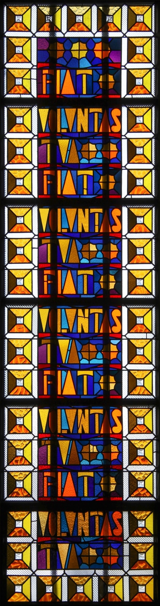 Un extrait du “Notre Père” en latin, “Fiat voluntas tuas” (que ta volonté soit faite) en lettres stylisées, traitées dans des couleurs allant de l’orange au jaune en passant par du beige, est répété cinq fois de haut en bas sur un fond de teintes froides composé de bleus et de violets. Une bordure constituée de carrés superposés (reprenant les coloris des lettres), encadrés de fines bordures en verre blanc cannelé entoure le tout.