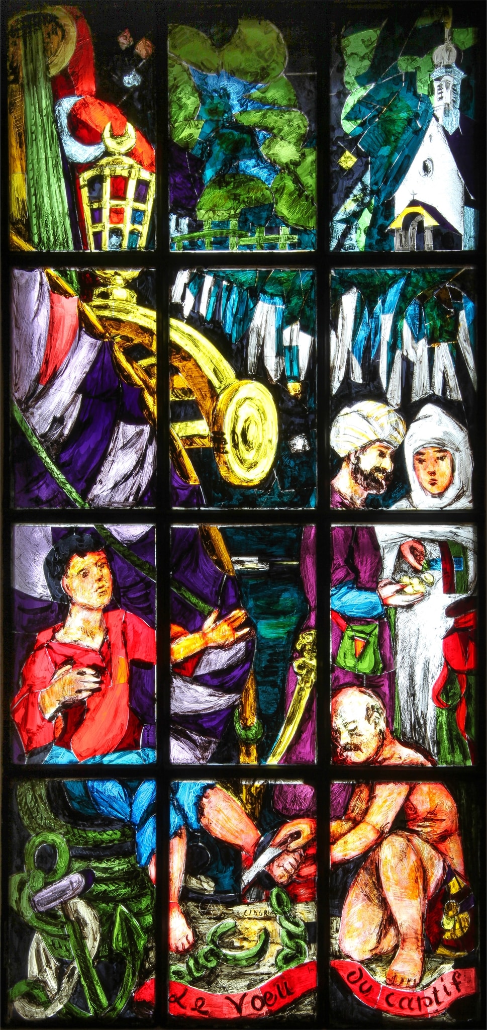 Fenêtre de format rectangulaire divisée en douze panneaux de mêmes dimensions, avec une composition unique figurant “Le Voeu du captif”, selon le titre inscrit sur la banderole tout en bas du vitrail. Au premier plan en bas, le captif est assis sur ce qui semble être un tas de cordes enroulées, levant les bras et la tête vers le ciel. Agenouillé à ses pieds, un personnage moustachu vêtu d’un pagne lui ôte ses fers du pied gauche, la seconde chaîne déjà détachée reposant au sol. La scène semble se dérouler sur un bateau, suggéré par une ancre posée dans le coin inférieur gauche, et par ce qui pourrait être des voiles et des cordages au-dessus du captif. Debout derrière le geôlier, un homme vêtu d’un turban et d’un sabre suspendu à sa ceinture, à laquelle pend également une bourse, est en train de recevoir de l’argent d’un autre personnage, portant la tenue de l’ordre des Trinitaires. Dans la partie supérieure, une sorte de carrosse est représenté, s’acheminant vers le sanctuaire Notre-Dame des Marches, où à sa gauche se devine une série de croix, ou une barrière.