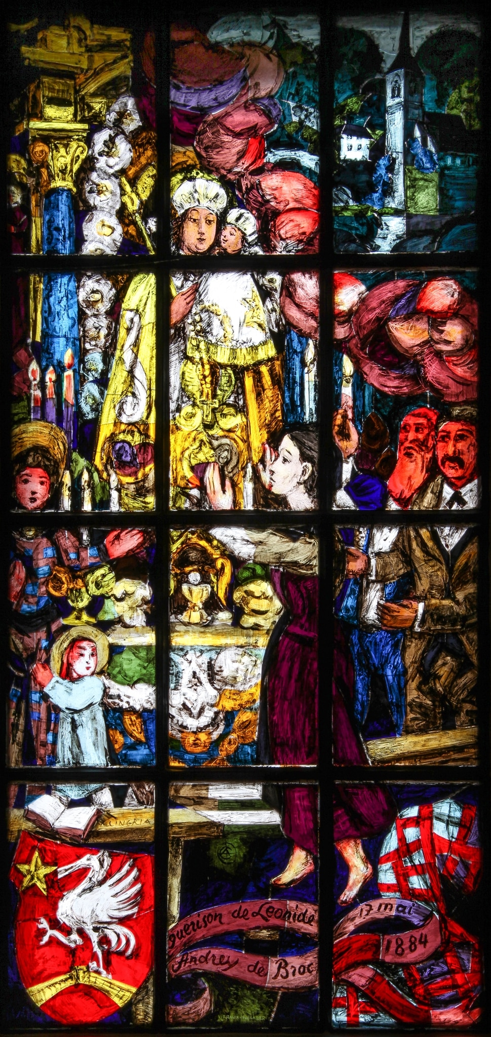 L’épisode illustré ici par Cingria est le premier miracle qui aurait eu lieu à la chapelle des Marches à la fin du XIXème siècle. Le 17 mai 1884, une jeune fille du nom de Léonide Andrey, atteinte d’une maladie qui l’empêche notamment de marcher, retrouve l’usage de ses jambes après avoir assisté à la messe à la chapelle. Cet événement est à l’origine de la renommée du sanctuaire brocois, un “petit Lourdes”, qui connaîtra depuis une longue série d’autres guérisons miraculeuses (Apic, JS, VB, 2007). Ce vitrail fait face à la verrière du “Voeu du Captif”, qui met en scène une autre histoire liée à la légende de Notre-Dame des Marches, la libération d’un prisonnier qui serait venu suspendre sa chaîne au pied de la statue de la Vierge de Notre-Dame des Marches de Broc en guise d’ex-voto, selon la promesse faite durant sa captivité (Gremaud, 1997, p. 7).