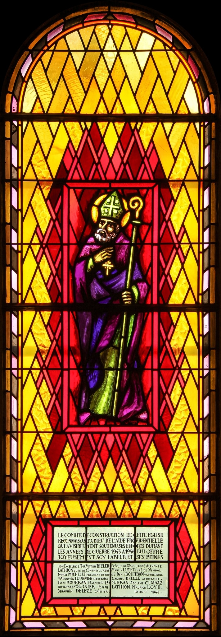 SON EXCELLENCE MGR. VICTOR BIELER ÉVÈQUE DE SION . L’ABBÉ ALPONSE / LATHION CURÉ DE CONTHEY . L’ABBÉ MARTIN LUYET CURÉ DE NENDAZ / CYRILLE MICHELET PRÉSIDENT DU COMITÉ . DENIS BOURBAN VICE-PRÉSIDENT / (CROIX) AUGUSTIN FOURNIER SECRÉTAIRE CANDIDE DELEZE SECRÉTAIRE . / ISAAC BOURBAN .MARCELIN BOURBAN . ADOLPHE CLAIVAZ / ALEXANDRE FOURNIER . JOSEPH LATHION. MAURICE LOYE / SERAPHIN DELEZE CAISSIER . PAQUES 1946 . (cartouche en bas, partie inférieure)