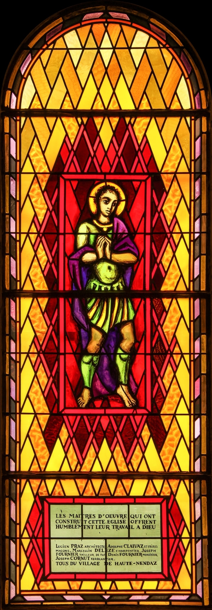Les deux vitraux du choeur de l’église Saint-Michel de Haute-Nendaz, comme l’ensemble des verrières, ont été réalisés en 1946 par l’artiste Paul Monnier. Cette création s'inscrit dans le contexte de la construction du sanctuaire par l’architecte Lucien Praz, natif de la commune et membre du Groupe romand de la Société Saint-Luc, dès 1934 (Groupe romand de Saint-Luc, 1934).