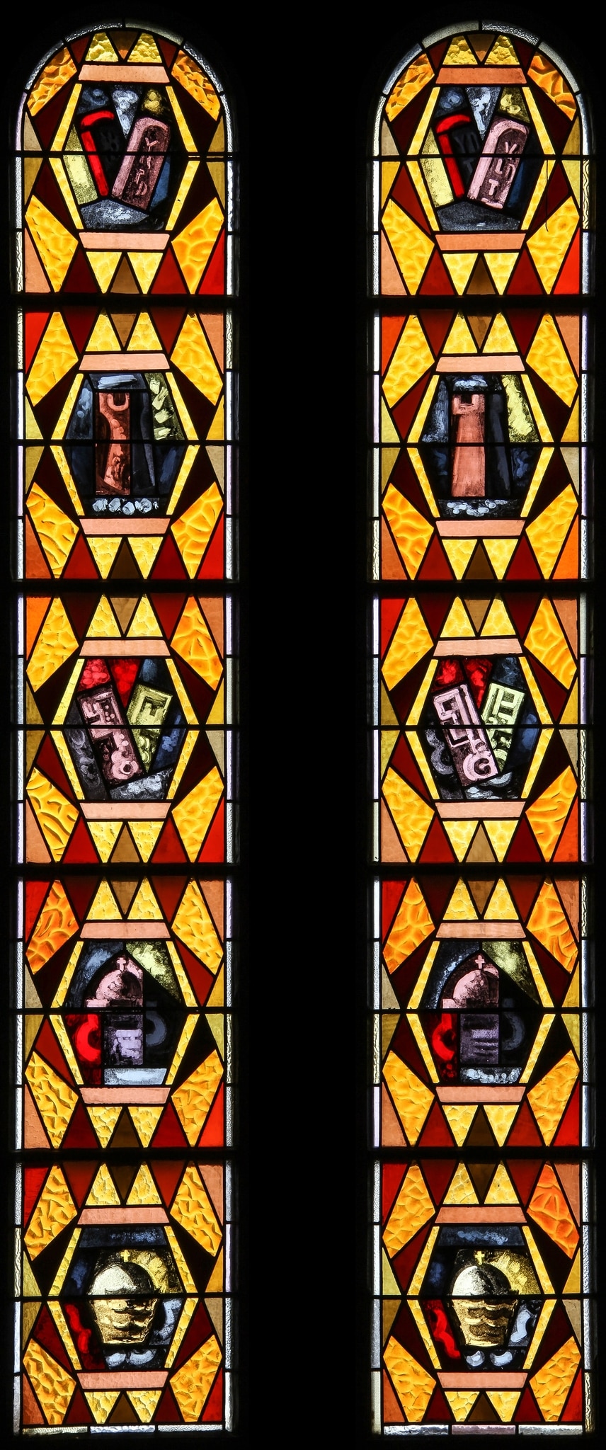 Fenêtre double en plein cintre composée de cinq panneaux comprenant chacun en leur centre un médaillon hexagonal sur un fond losangé. Chaque hexagone comporte un motif symbolique différent, peint à la grisaille. De bas en haut, on trouve la tiare pontificale, la représentation stylisée de la basilique Saint-Pierre de Rome, reconnaissable par son dôme et sa colonnade, les clés de saint Pierre, une tour et les tables de la loi. Les symboles se répètent à l’identique sur la fenêtre de gauche et sur celle de droite, avec de légères variations.