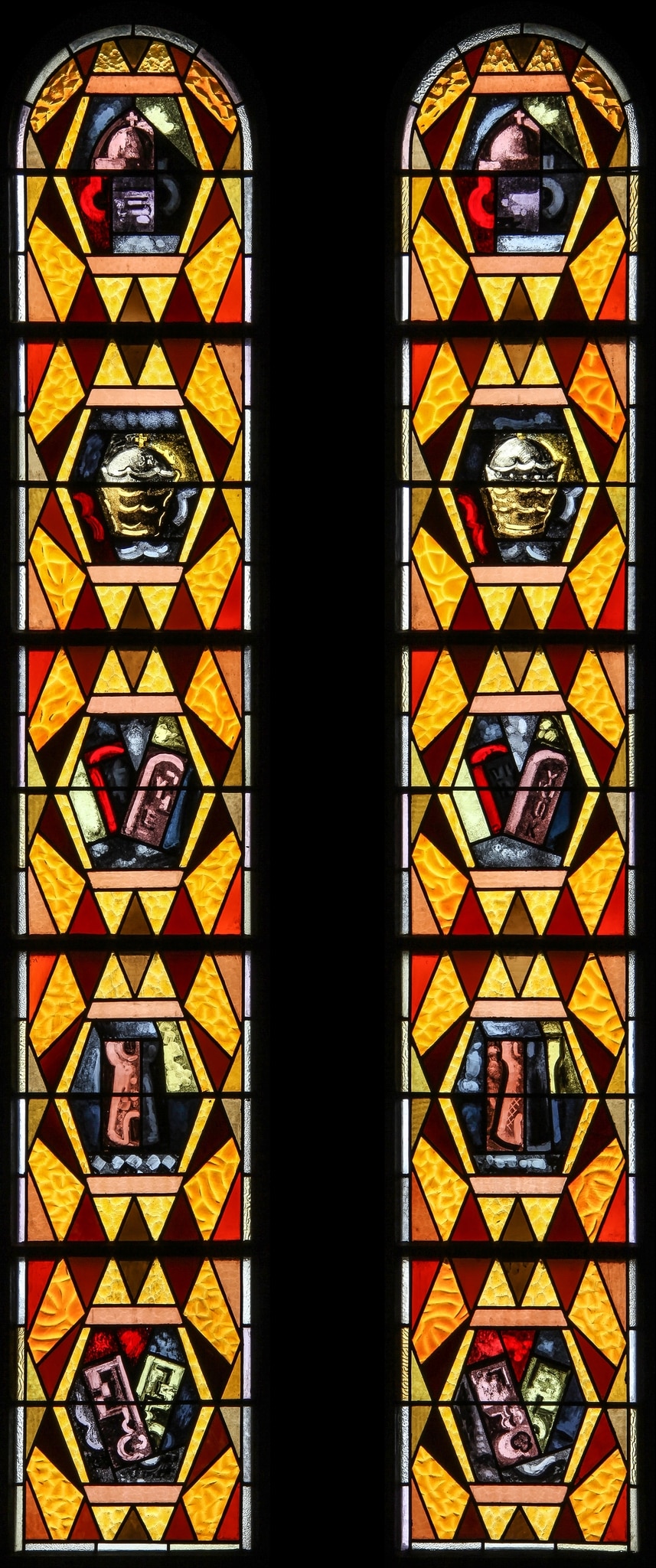 Les fenêtres de la nef représentent des symboles de l’Église liés au saint patron de l’édifice, l’apôtre Pierre, qui en tant que premier pape de Rome représente l’autorité de l’Église catholique sur terre. La tiare pontificale, la basilique Saint-Pierre de Rome et les clés renvoient directement à la papauté, tandis que les tables de la Loi et la tour symbolisent l’Église chrétienne au sens large. Malgré cette iconographie qui s’inscrit dans le programme iconographique dévolu à saint Pierre, culminant dans le choeur avec la monumentale peinture murale de Paul Monnier, le rôle de ces verrières est avant tout décoratif. Les médaillons figurés ne constituent qu’une petite partie de l’espace total occupé par un découpage géométrique de verres de différentes structures, verre chenillé et verre cathédrale, dont les teintes chaudes sont des rappels de la polychromie générale de la nef, déclinée autour de trois couleurs principales : le jaune, le rouge et le brun. On retrouve un parti similaire dans la nef de Sorens, une autre église de Fernand Dumas, où les vitraux de Cingria déploient une inscription dont la signification est évidemment très importante, mais dont l’artiste se sert dans une perspective en premier lieu décorative (par exemple, GSL_326). Ces vitraux, appelés “grisailles”, avaient l’avantage de coûter moins cher que des verrières figuratives lors de leur production par un atelier. A Murist, il apparaît clairement que les vitraux occupent une place secondaire par rapport à d’autres éléments de la décoration, comme les peintures murales ou le chemin de croix. Néanmoins, ces verrières expriment toute l’expérience de décorateur de Landry et son sens de l’ensemble.