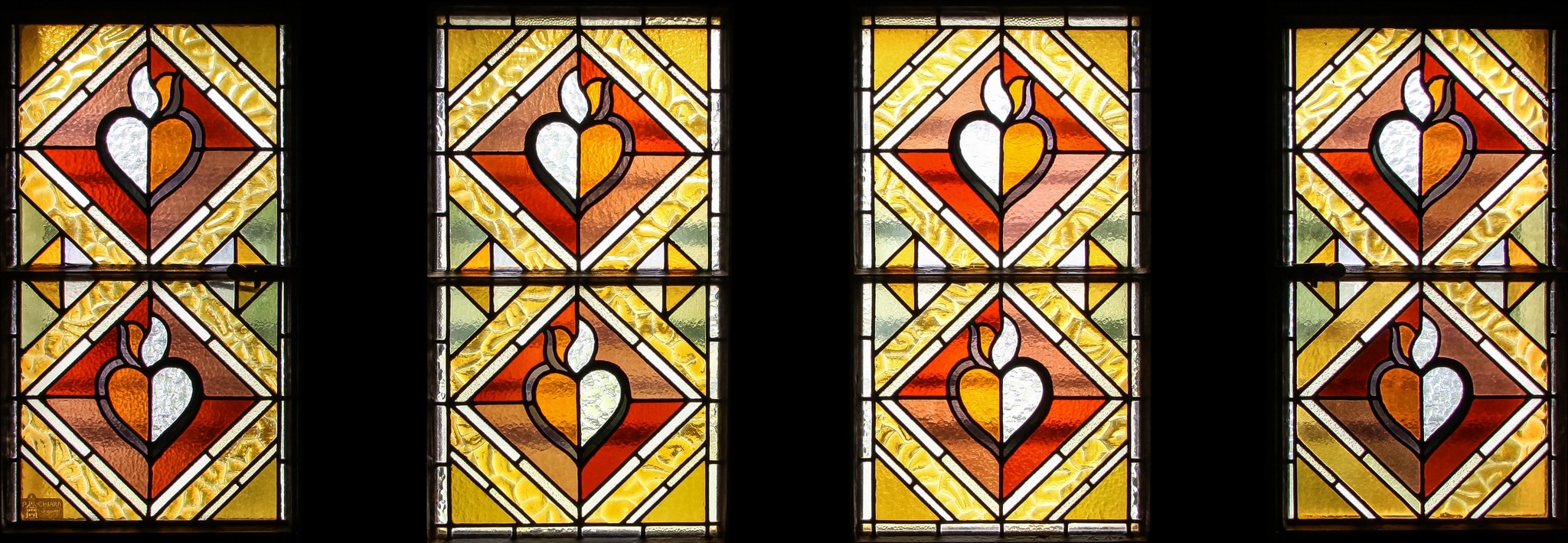 Ces quatre fenêtres, de même que celles qui se situent au nord-est de la sacristie, sont des oeuvres ornementales dont le rôle est d’embellir la sacristie en la protégeant des regards, et permettant de tamiser la lumière extérieure. Elles présentent un choix très intéressant de verres de différentes textures : verres chenillés et verres cathédrale, également utilisés dans les fenêtres du choeur et de la nef. Les teintes choisies reprennent les couleurs chaudes dominantes dans la décoration intérieure de l’église : rouge, jaune, orange et brun. Malgré la modestie de ces vitraux, ils expriment toute l’expérience de décorateur de Landry et son sens de l’ensemble.