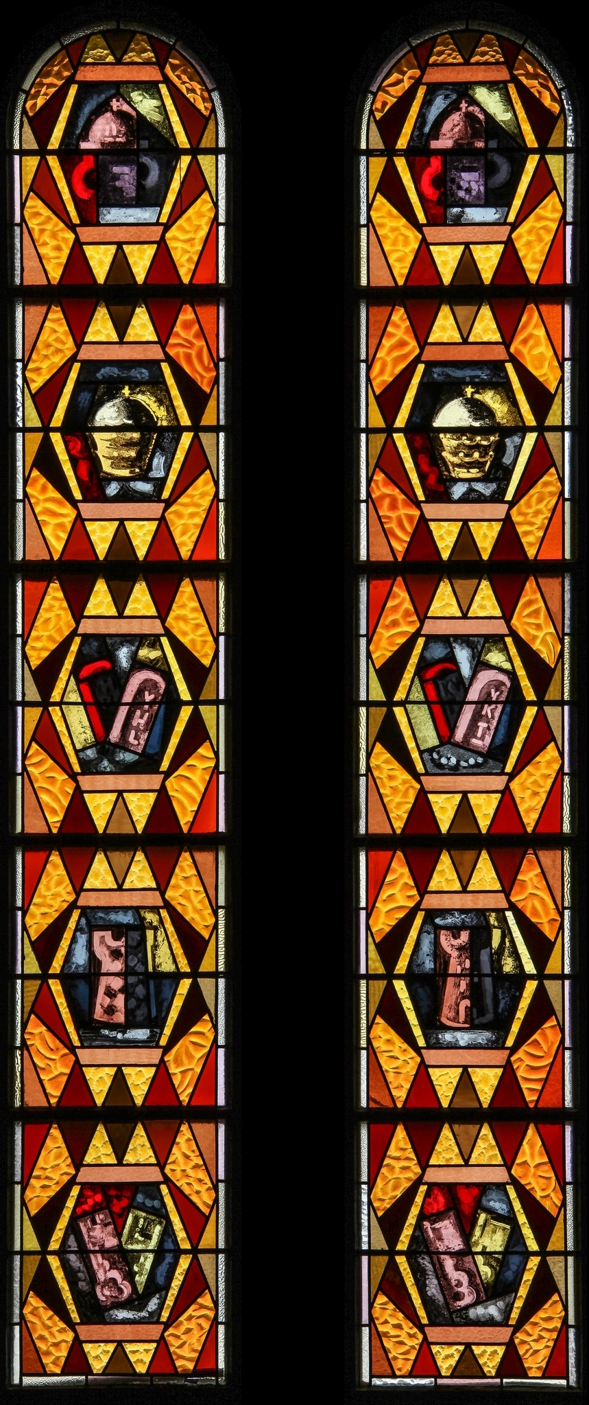 Ces éléments figuratifs sont encadrés d’une large bordure ornementale composée de pièces de verre structuré avec différentes textures, dans les teintes chaudes : jaune, orange, rouge, rose et brun. Un fin filet de verre clair sur le bord extérieur encadre l’ensemble de ces deux verrières.