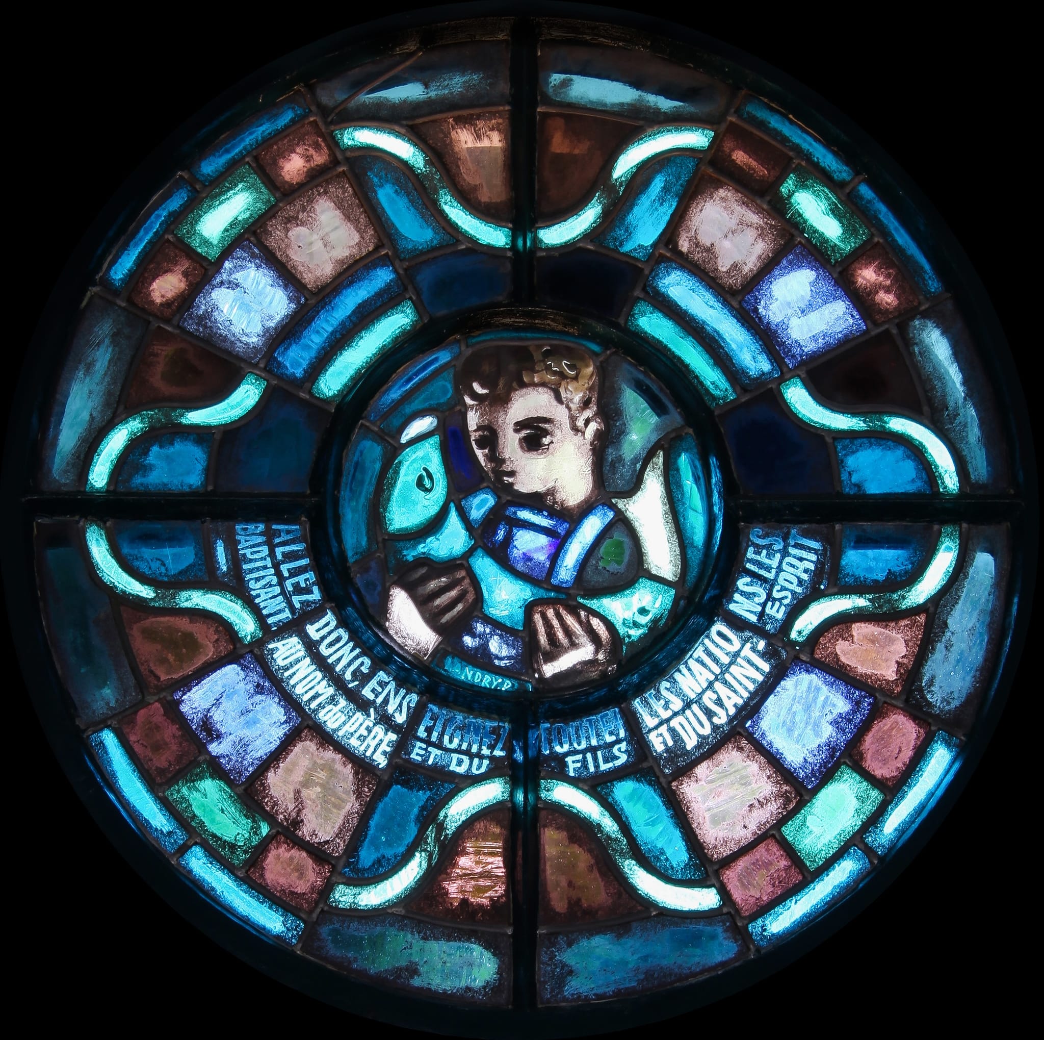 Les huit vitraux du baptistère – le huit étant un chiffre se retrouvant souvent dans l’architecture des baptistère puisqu’il est associé à la Résurrection – ont comme rôle premier de moduler la lumière arrivant dans cet espace dont l’importance liturgique est capitale. L’iconographie y joue un rôle secondaire, comme l’indique la place réduite qu’occupent les parties figurées par rapport aux zones ornementales. Cet aspect semble être assez récurrent chez Landry, qui envisage le vitrail avant tout dans une perspective décorative. Il optera pour un parti similaire à Travers pour les vitraux ornant l’espace dévolu au baptistère (GSL_202). Utilisant des tons à dominantes vertes, bleues, brunes et roses, qui évoquent l’eau et se marient parfaitement avec la peinture murale qui se déploie tout autour, il utilise une forte grisaille sur les cinq vitraux qui se situent du sud à l’ouest, tout en laissant nus les trois vitraux de l’est au nord. Conçus uniquement avec des verres industriels à textures aux teintes pastel, ils permettent un éclairage plus soutenu et une arrivée de lumière par l’arrière par rapport au positionnement de l’entrée. Landry choisit pour les médaillons centraux des représentations symboliques chrétiennes ou des figures emblématiques du christianisme, à l’instar du motif du poisson et de l’ancre, de la colombe du Saint-Esprit, du Bon berger et de la Vierge et du Christ. La présence répétée du poisson, que l’on retrouve dans le vitrail central, le seul comportant une inscription, évoque aussi l’eau du baptême et l’entrée symbolique dans la communauté chrétienne.