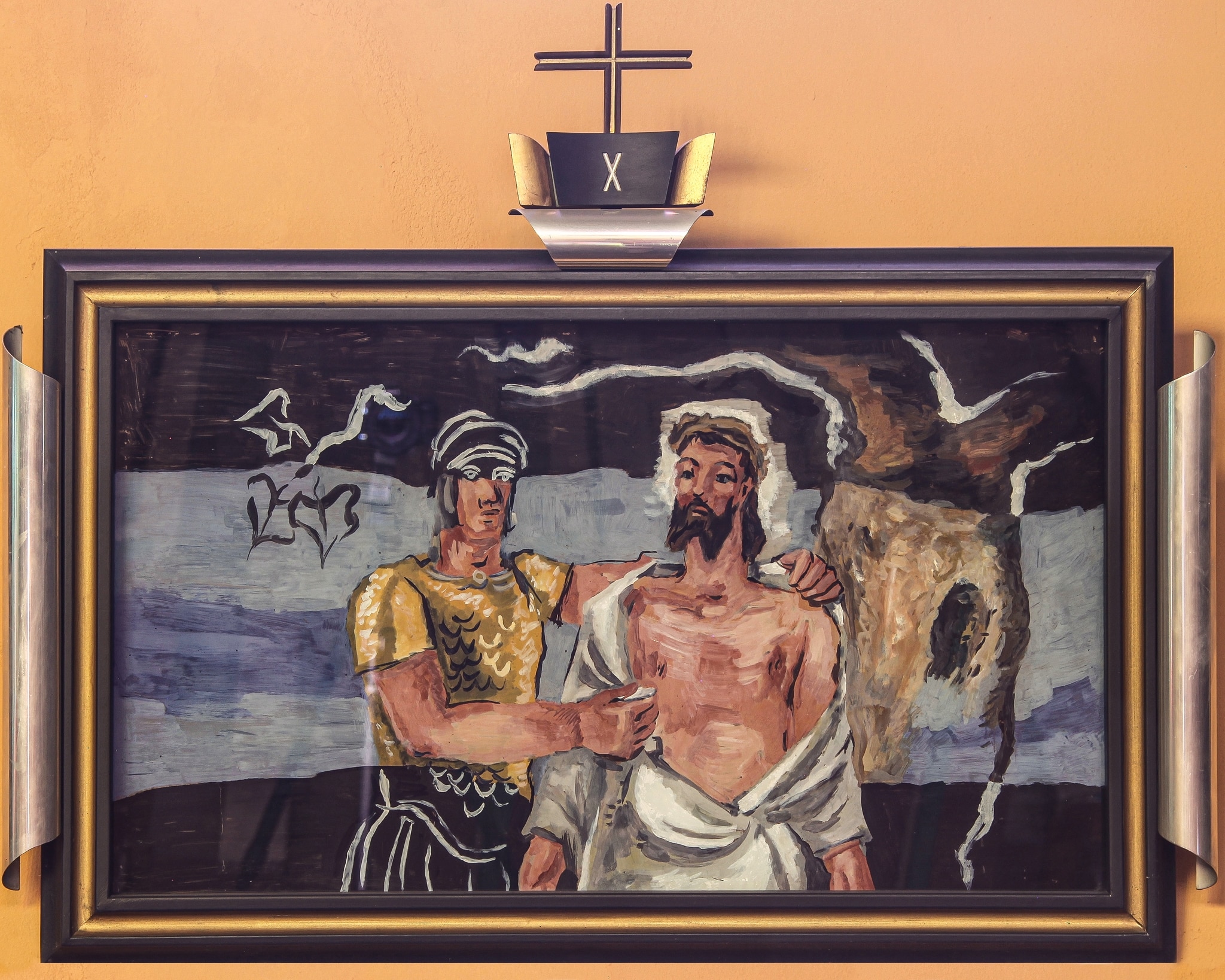 La dixième station évoque la scène où Jésus, en arrivant au Golgotha, est dépouillé de ses vêtements avant d'être crucifié. Un soldat romain se tient à côté du Christ et lui retire sa tunique blanche, révélant son torse. En arrière-plan, un arbre stylisé complète la composition.