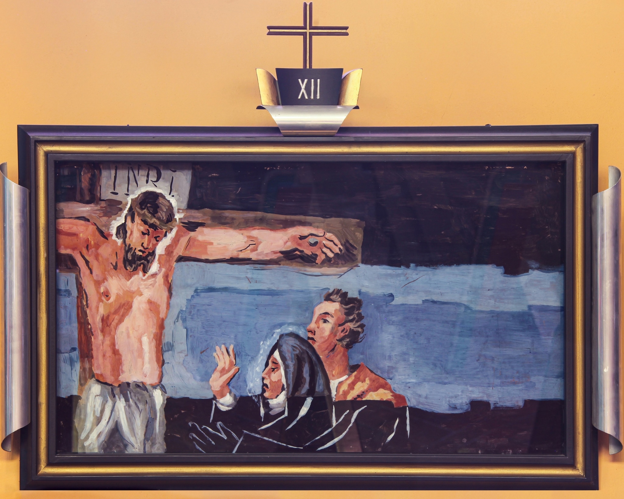 Sur un fond bleu clair et foncé, la composition de la douzième station du Chemin de croix présente Jésus mort sur la croix à gauche du tableau. Marie, sa mère, et Saint Jean, sont représentés de profil, à sa droite.