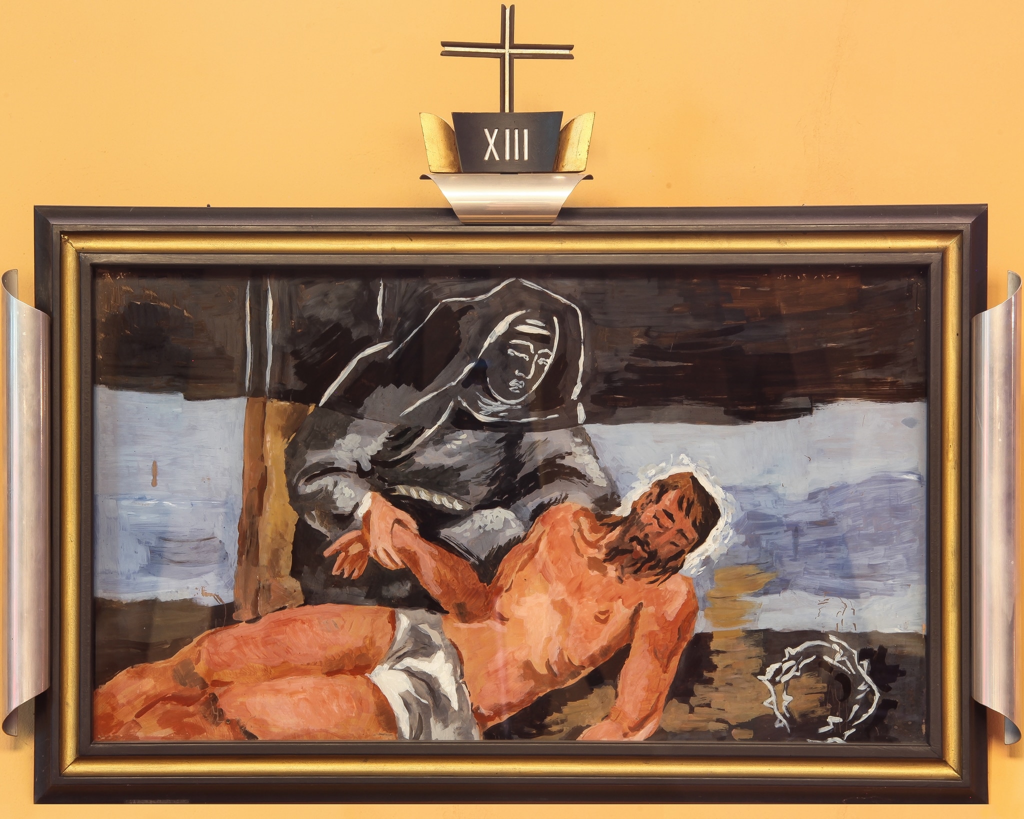 La treizième station du Chemin de croix évoque le moment où le corps de Jésus est détaché de la croix et remis à sa mère. La composition est centrée sur les deux figures principales : Marie et Jésus. La Vierge, vêtue d'un manteau sombre, est assise et tient le corps inerte de son fils sur ses genoux. Un drapé blanc cache la nudité de celui-ci. La croix d'épines est sur le sol à côté de lui.