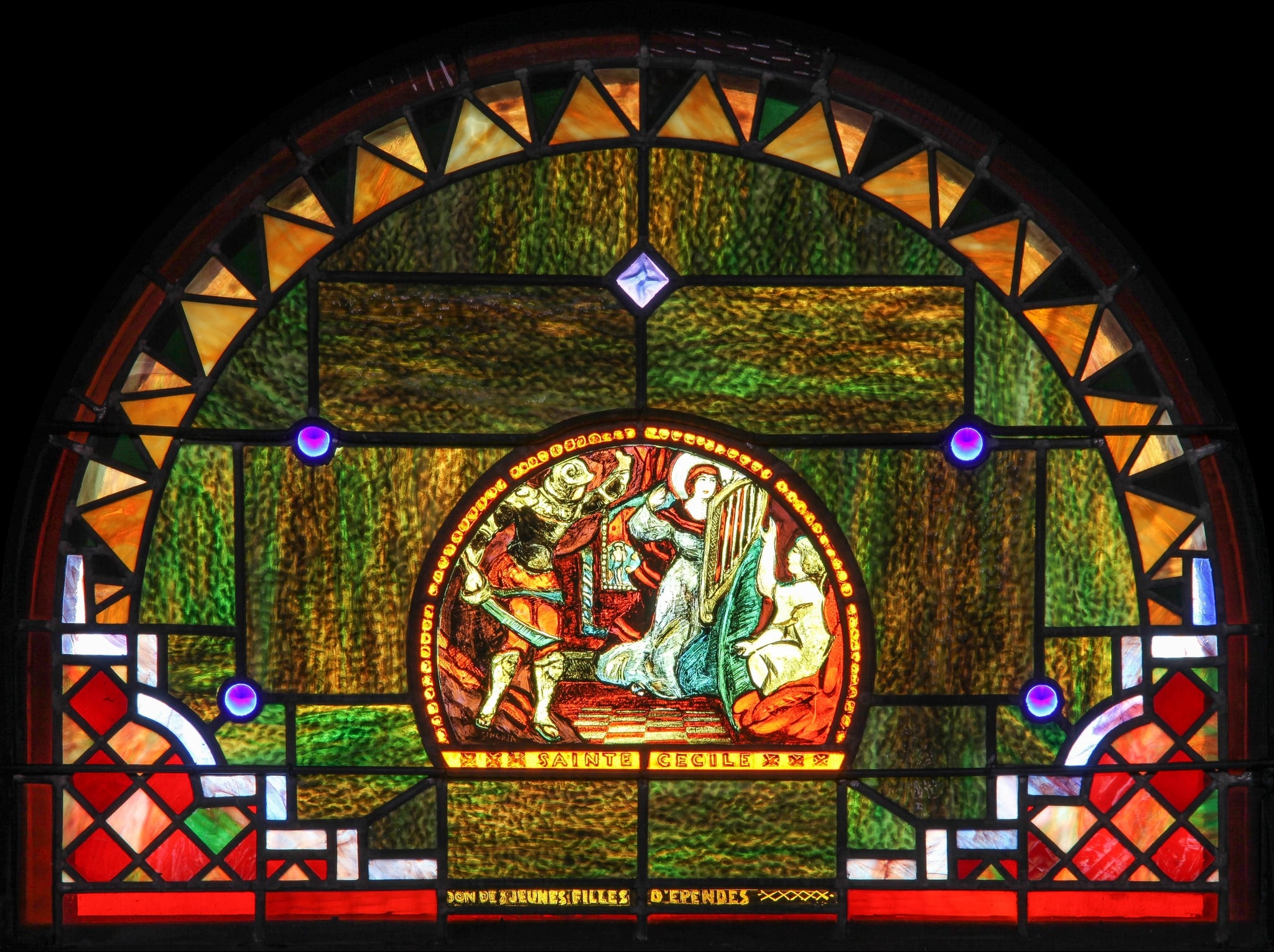 Vitrail en demi-cercle composé d’un médaillon au centre et encadré d’une large bordure ornementale. Dans le médaillon à droite figure Cécile jouant de la harpe, alors qu’un personnage assis de profil, peut-être un ange, lui fait face. La sainte lève le bras droit pour se protéger d’un soldat casqué qui apparaît sur la gauche pour l’arrêter, tenant dans sa main droite un sabre. A l’arrière-plan, on aperçoit par la fenêtre un édifice devant lequel se tient debout un homme torse nu et auréolé, les bras attachés derrière le dos, qui pourrait être Valérien, le mari de Cécile, au moment de son martyre.