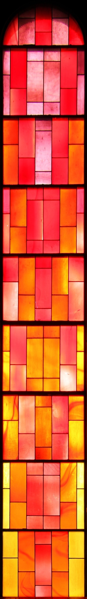 Fenêtre géométrique en plein-cintre divisée en neuf panneaux constitués de verres colorés rectangulaires de différentes tailles, disposés verticalement. Le vitrail est traité dans des teintes chaudes avec des dominantes de rouge et orange, nuancées par des pièces de verre rose au centre, de violet et rouge-brun dans les extrémités. Plusieurs verres présentent des variations de teintes avec des insertions de couleurs différentes. Un subtil effet de dégradé anime la fenêtre, plus claire dans sa partie inférieure grâce à l’utilisation de verres plus transparents, tandis que plus l’on remonte en direction du sommet de la fenêtre, plus les teintes sont foncées et les verres opaques.