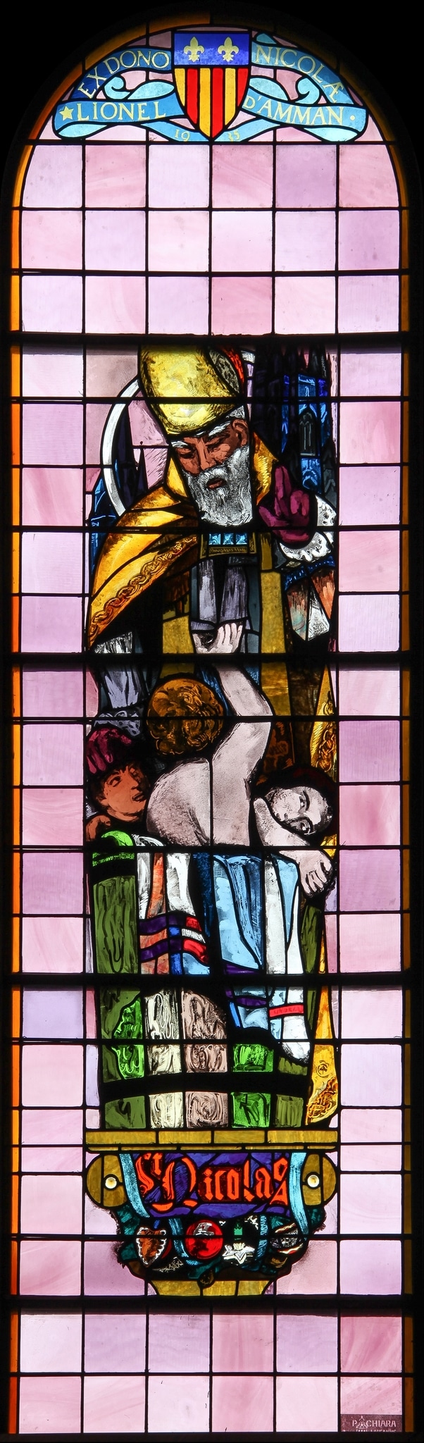 Le choix de saint Nicolas pour cette verrière fait référence au prénom du donateur, Nicolas-Lionel d’Amman, importante famille patricienne d’Ependes, propriétaire du château (Troxler, Weideli, 2020).