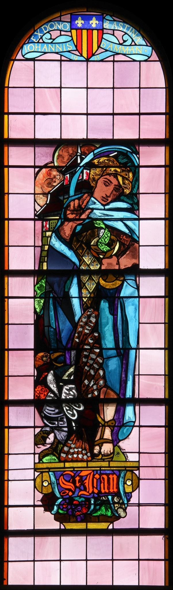 Le choix de l’évangéliste Jean pour cette verrière fait référence au prénom du donateur, Jean d’Amman, dont la famille est propriétaire du château d’Ependes qui est représenté dans le fond du vitrail (Troxler, Weideli, 2020). Cette famille patricienne importante d’Ependes a été impliquée dans la construction de l’église et a financé quatre vitraux.