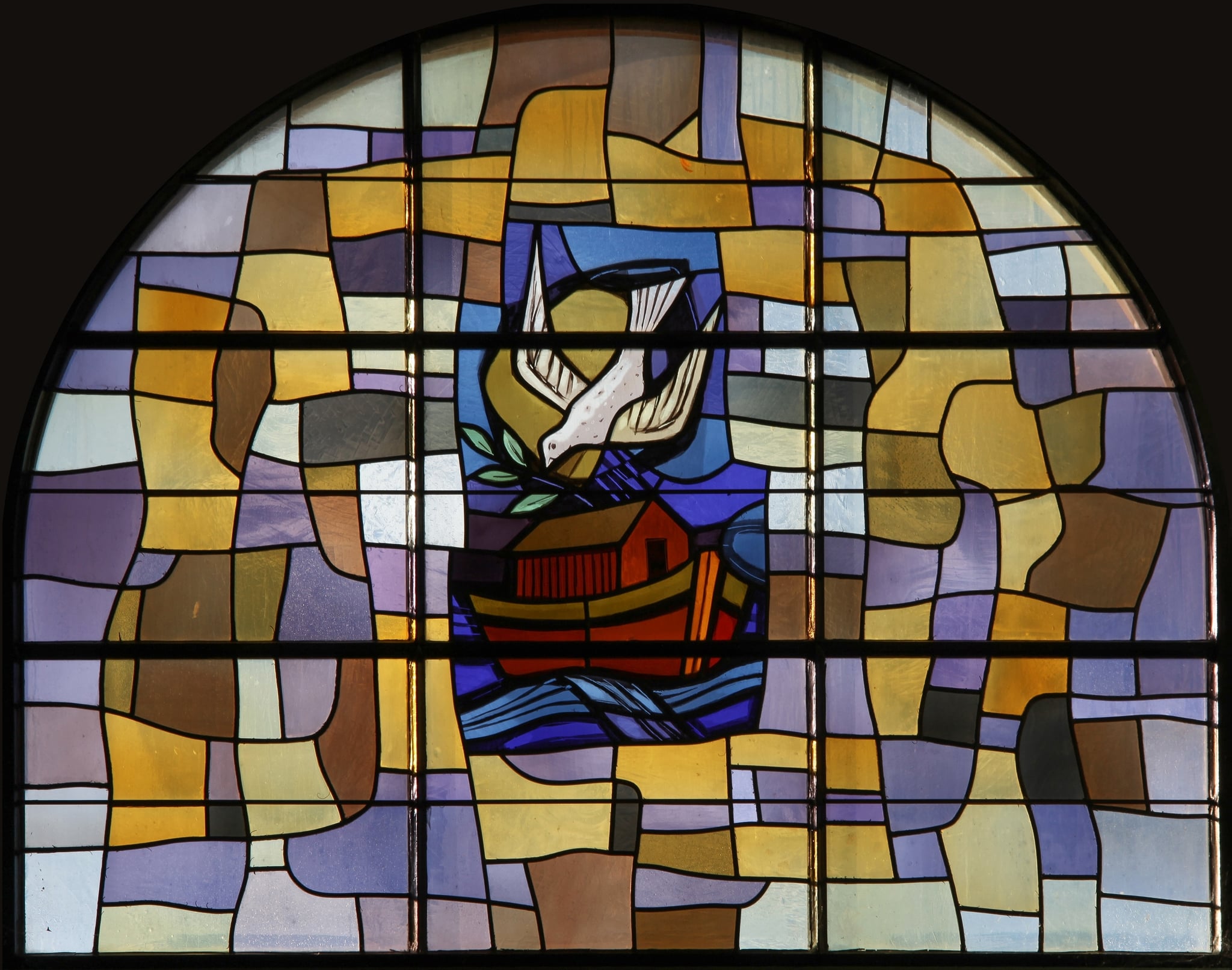 Au centre du vitrail abstrait, sur un fond bleu, se détache une colombe, un brin d’olivier dans le bec, qui revient vers l’arche de Noé voguant sur les flots.