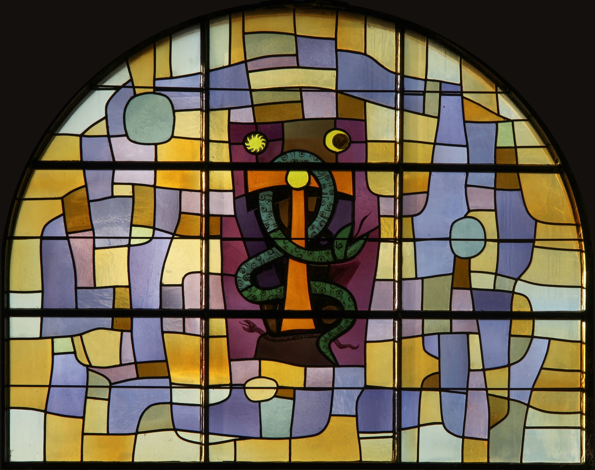 Au centre du vitrail abstrait, sur un fond mauve, un serpent s’enroule sur les bras d’une croix, au-dessus de laquelle apparaissent le soleil et la lune.