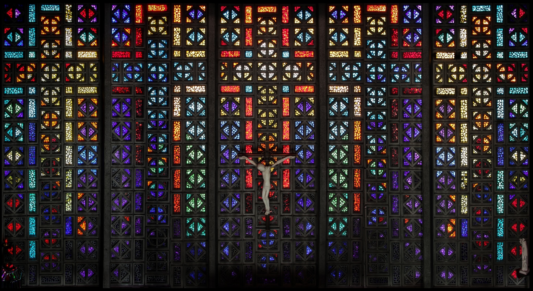 Cinq parois de claustras de béton habillées de dalles de verre sont disposées sur toute la largeur du choeur, suivant une légère courbe. Ces claustras se composent d’éléments structurels de béton présentant des formes géométriques variées (croix inscrites dans des cercles, rectangles simples et losanges coupés en deux dans le sens de la hauteur), disposés de manière à former le motif d’une grande croix latine.