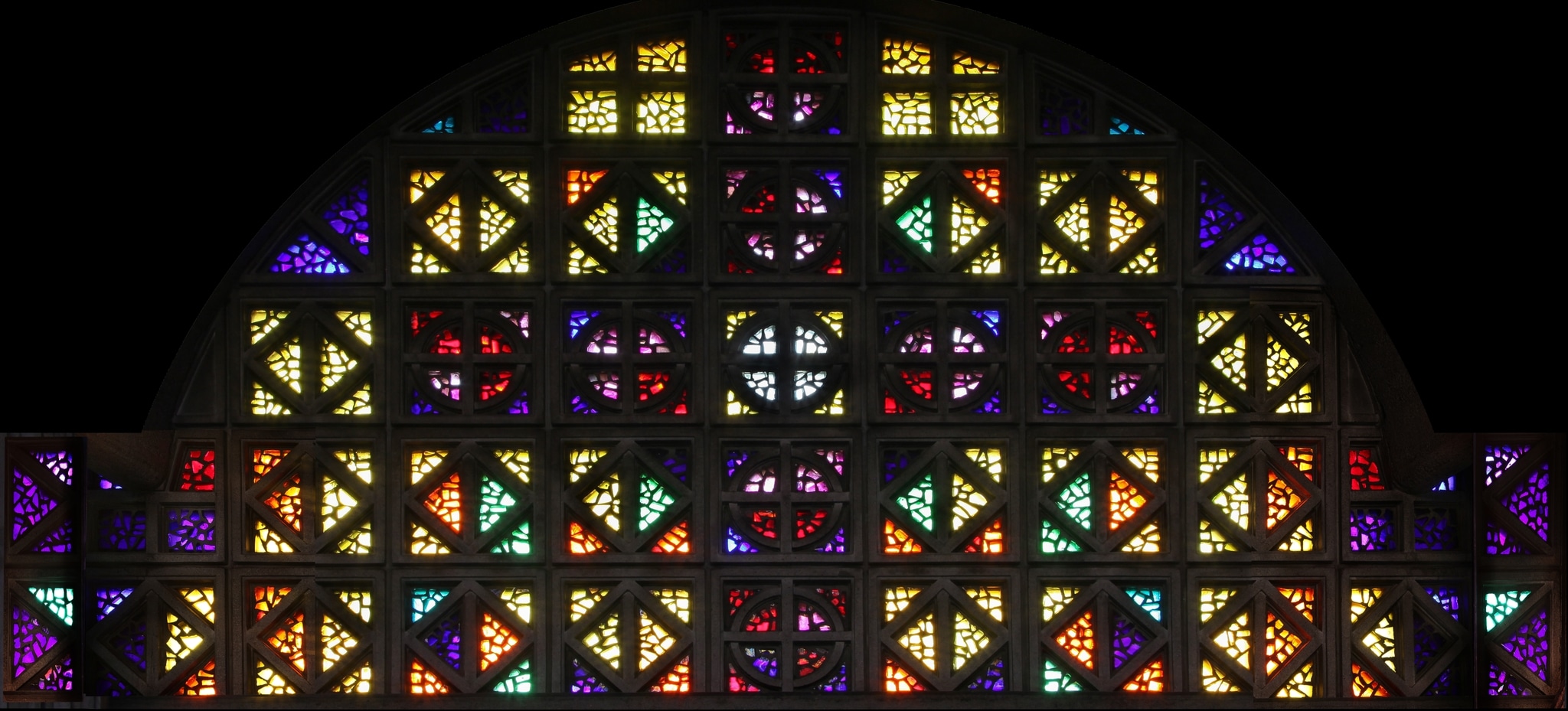 Ce sont ces teintes qui donnent vie à l’ensemble constitué par les parois de claustras et les haut-jours. Cingria a disposé les coloris de manière symétrique tout autour de l’axe constitué par le panneau central derrière l’autel, et au sein de chaque panneau a conçu les harmonies de manière à mettre en évidence le motif de croix des claustras, en réalisant des contrastes entre teintes chaudes et froides. Dans les haut-jours étroits, l’artiste imagine un véritable arc-en-ciel de couleurs se déployant de la tribune des orgues jusqu’au choeur, avec une parfaite concordance entre les parois nord-est et sud-ouest.