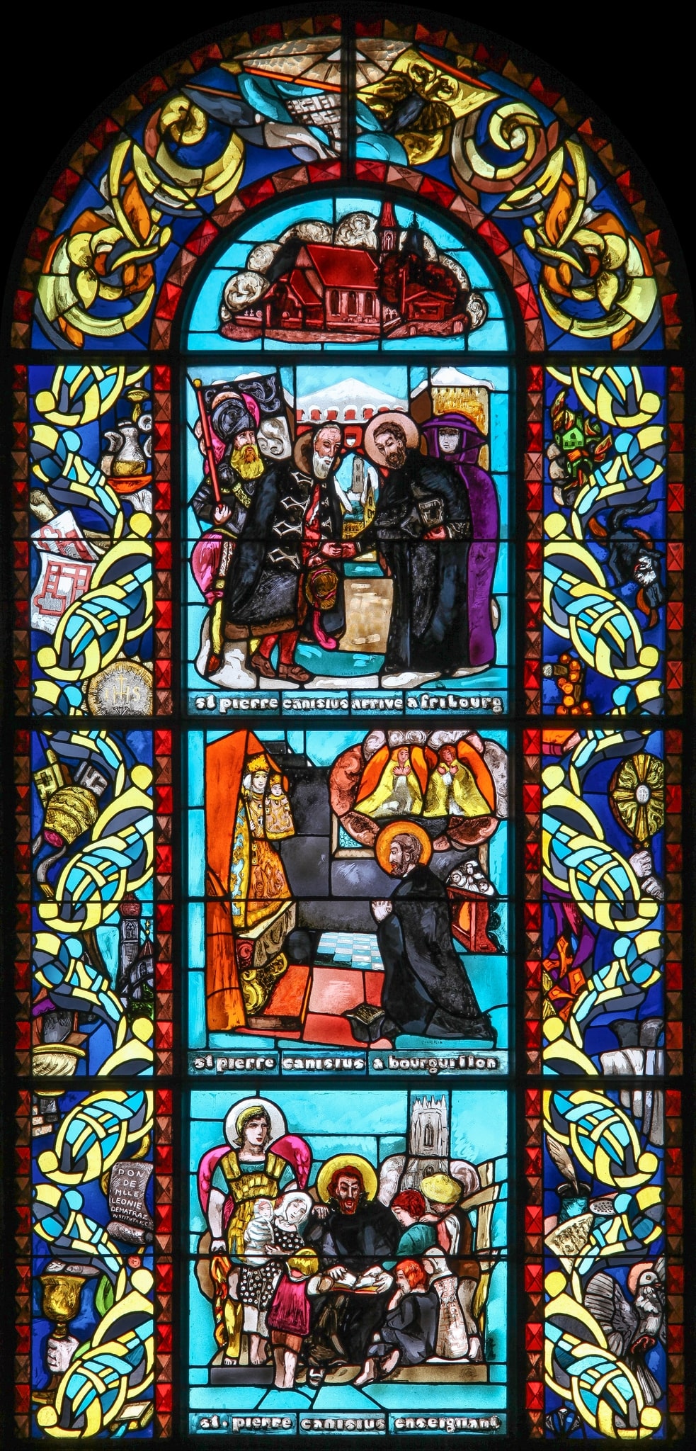 Fenêtre en plein cintre composée, sur un fond bleu ciel, de trois scènes superposées comportant chacune un épisode de la vie de saint Pierre Canisius, accompagnés d’inscriptions les décrivant.