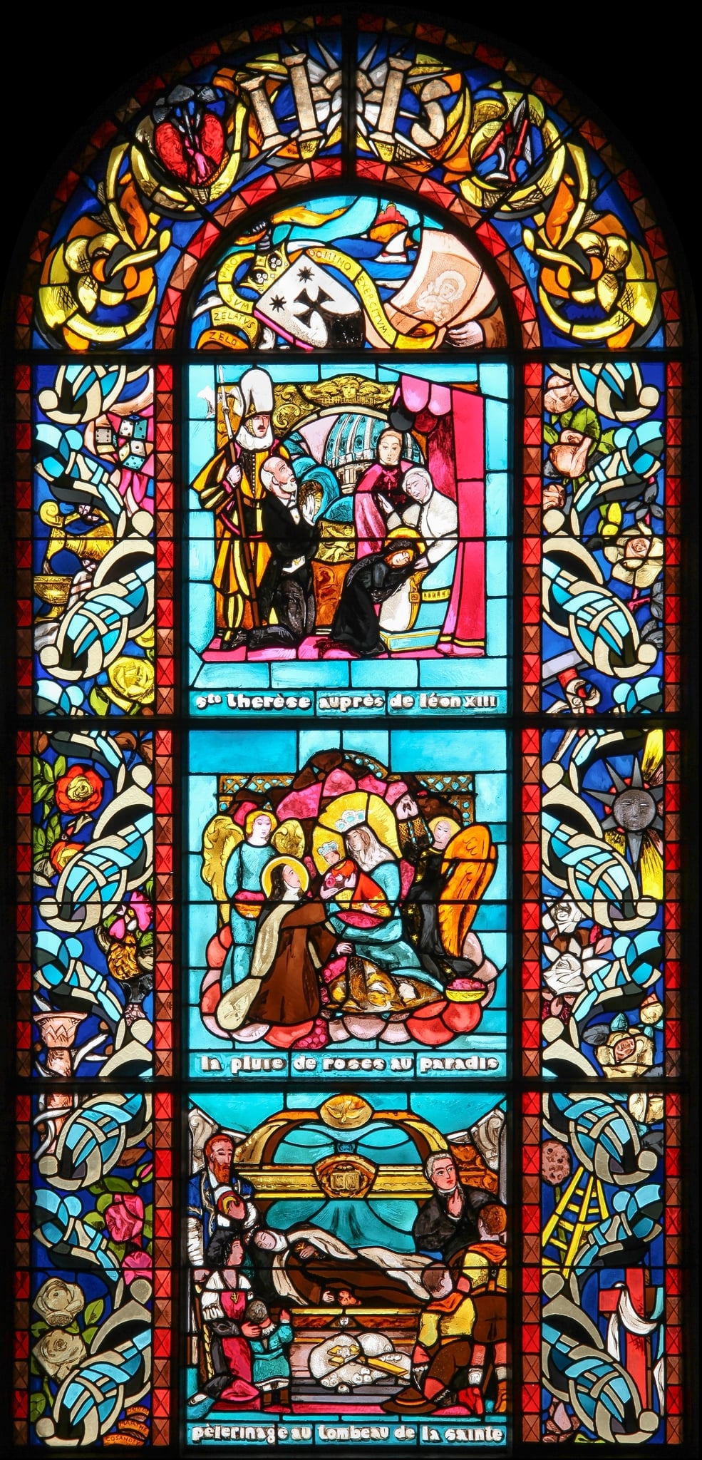 Fenêtre en plein-cintre composée, sur fond bleu ciel, de trois scènes superposées comportant chacune un épisode de la vie de sainte Thérèse de Lisieux, accompagnés d’inscriptions les décrivant.