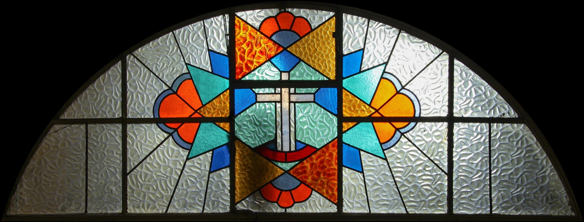 Lunette en arc surbaissé avec au centre une croix posée sur une base concave, érigée au centre d’une grande étoile à six branches à l’intermédiaire et sur lesquelles sont disposés quatre trilobes orange et bleus. Des triangles de deux tons de bleus complètent l’ornementation.