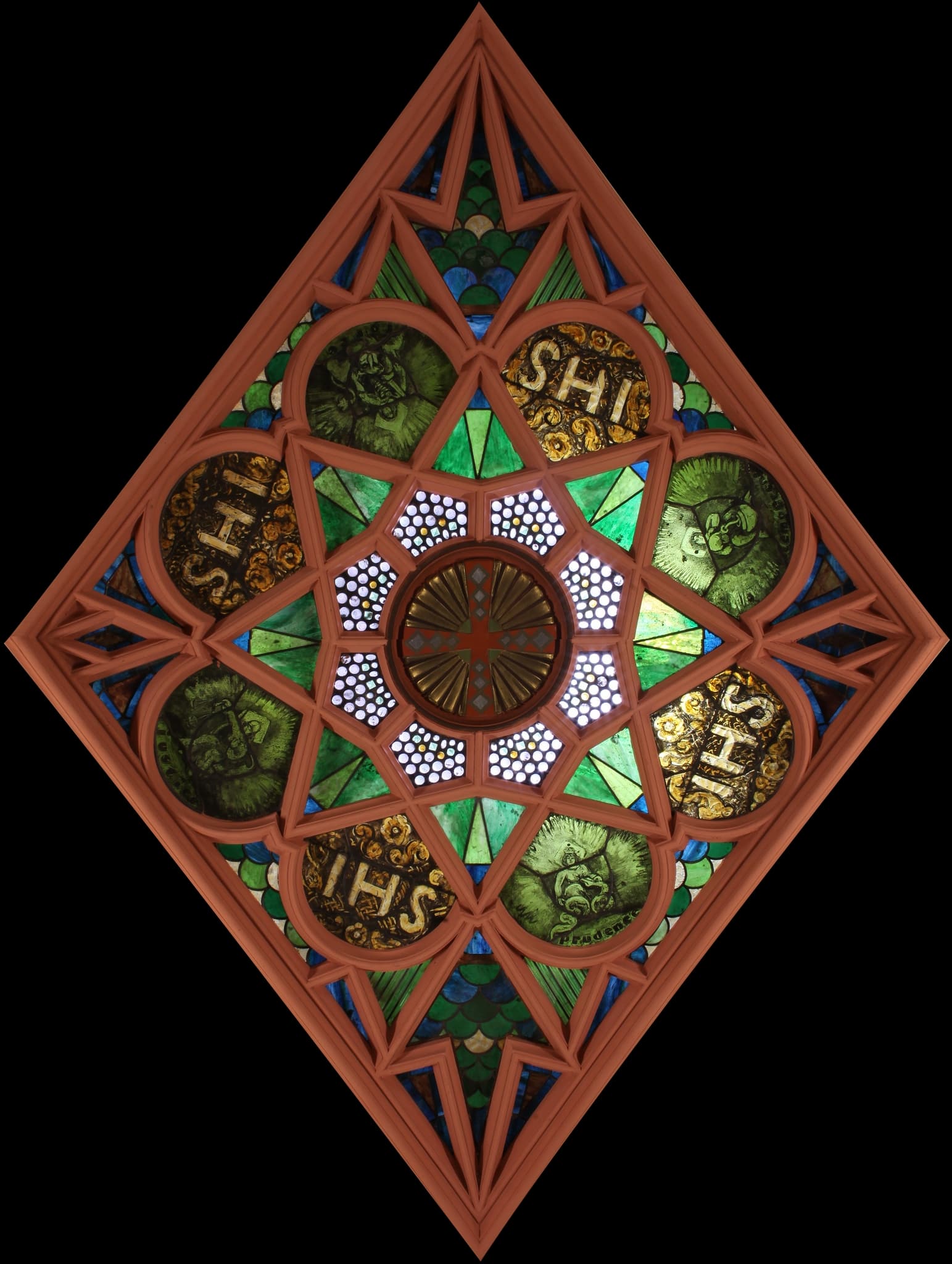 Baie ajourée située au sommet de la voûte en berceau de la nef, apportant un éclairage zénithal dans cette partie de l’édifice. En forme de losange, elle est formée d’un remplage de plâtre peint, dont les formes géométriques sont réparties symétriquement à partir du cercle central, également en stuc moulé, orné d’une croix grecque polychromée. Les jours sont garnis de verres industriels de différentes textures. Les hexagones irréguliers qui entourent le centre sont remplis de cabochons translucides clairs, favorisant l’arrivée lumineuse. Tout autour, des triangles sont composés de verres irisés à dominante verte, puis de huit médaillons figurés, dont quatre comportent le monogramme du Christ “IHS”, entouré de motifs floraux et végétaux, et quatre des personnifications des vertus cardinales : Prudence, Tempérance, Force et Justice. Les extrémités du losange sont garnies de verres irisés et à textures de différentes sortes, dont certains en forme d’écailles.