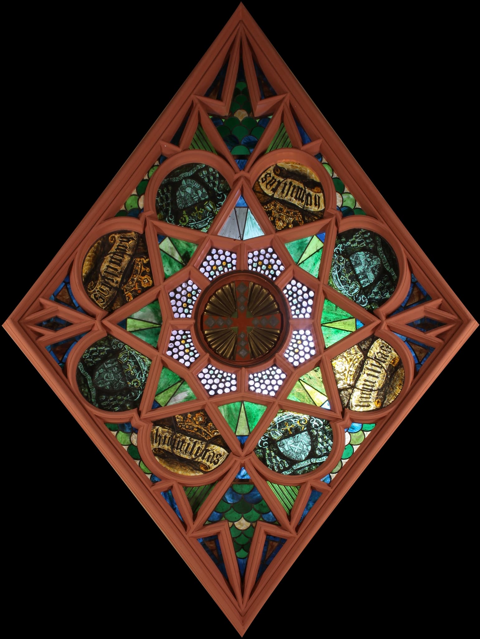 Baie ajourée située au sommet de la voûte en berceau de la nef, apportant un éclairage zénithal dans cette partie de l’édifice. En forme de losange, elle est formée d’un remplage de plâtre peint, dont les formes géométriques sont réparties symétriquement à partir du cercle central, également en stuc moulé, orné d’une croix grecque polychromée. Les jours sont garnis de verres industriels de différentes textures. Les hexagones irréguliers qui entourent le centre sont remplis de cabochons translucides clairs, favorisant l’arrivée lumineuse. Tout autour, des triangles sont composés de verres irisés à dominante verte, puis de huit médaillons figurés, dont quatre comportent l’inscription “humilitas” surmontée d’une couronne, et quatre des armoiries de différents évêques du diocèse de Lausanne, Genève et Fribourg. Les extrémités du losange sont garnies de verres irisés et à textures de différentes sortes, dont certains en forme d’écailles.