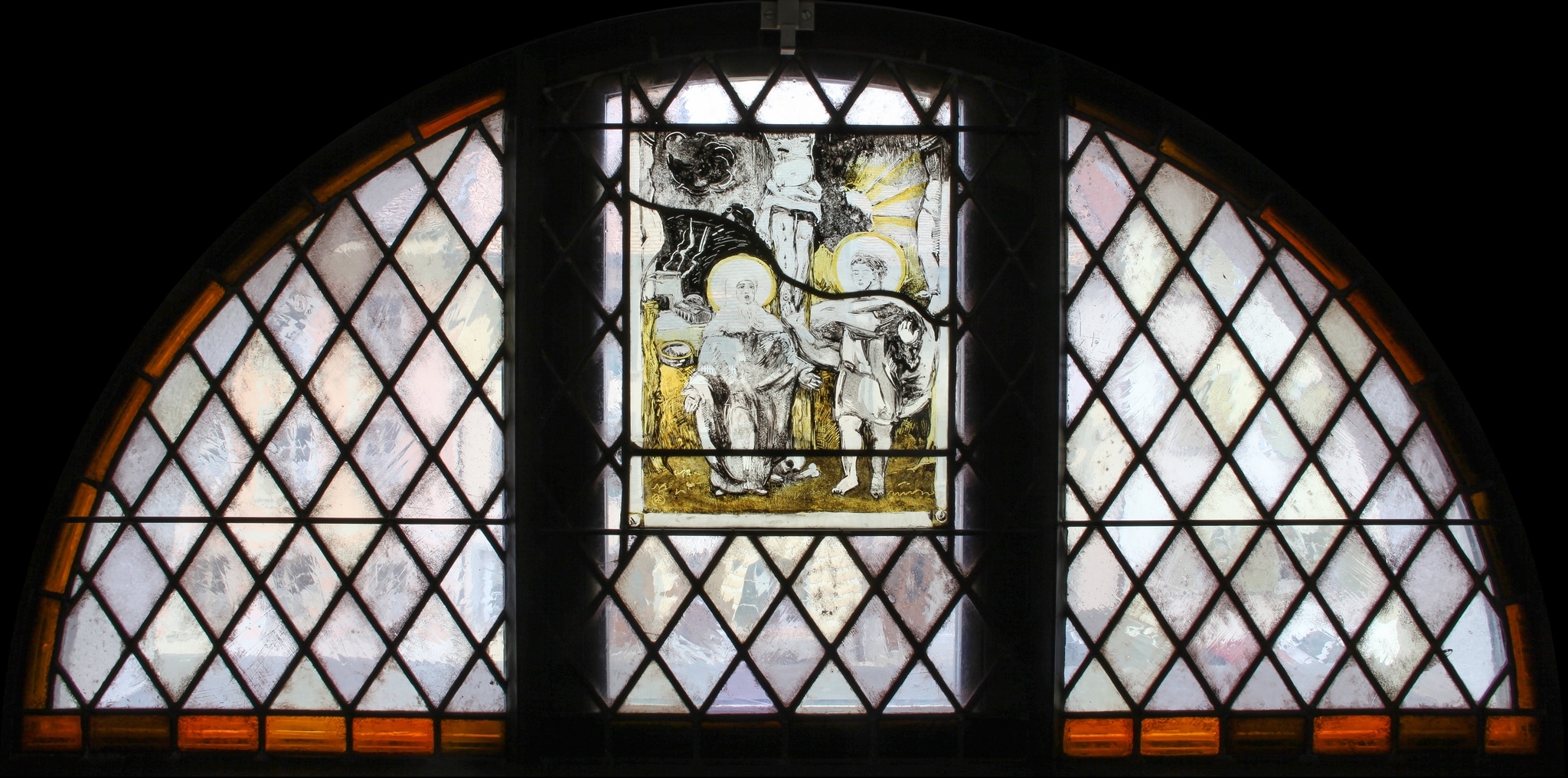Cette verrière a été réalisée en 1928-1929 par Alexandre Cingria et l’atelier Chiara, pour la chapelle du Pensionnat Saint-Charles de Romont. Sa réalisation s’inscrit dans le chantier de décoration du petit sanctuaire, confié à plusieurs artistes membres du Groupe de Saint-Luc, dont Gaston Faravel pour la polychromie générale et les peintures murales, Marcel Feuillat pour l’orfèvrerie et Marguerite Naville pour les mosaïques de l’autel (Roulin, 1930 ; Aubert, 1945, p. 69). Cingria est chargé des quatre baies à claustras situées au sommet de la voûte de la nef et du choeur, du cycle des six vitraux consacrés à la Vierge éclairant les bas-côtés et de ce vitrail pour la sacristie. La chapelle s’intègre dans le nouveau bâtiment du pensionnat construit entre 1927-1928 par l’architecte Fernand Dumas, autre membre emblématique du Groupe de Saint-Luc. Cette construction permet d’agrandir le pensionnat qui comprenait déjà un premier bâtiment également construit par Dumas en 1913, sa première réalisation en tant qu’architecte (Roulin, 1930, p. 101-105).