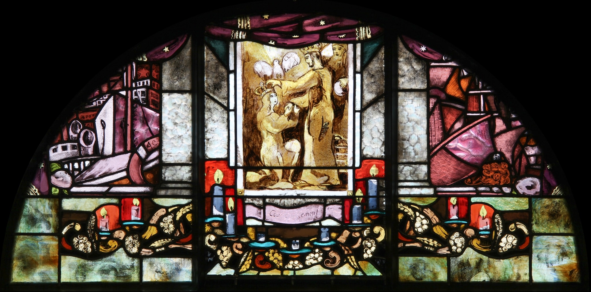 Pour ce cycle de six verrières consacrées à la Vierge, Cingria joue avec les plans et différents niveaux de réalité, pour donner l’impression que la scène figurée au centre est un tableau de retable intégré au sein d’un autel dont l’avant serait situé juste sous les yeux du spectateur. Partiellement recouvert d’un rideau, ce retable est encadré de deux pans de parois traité avec un verre imitant la texture du marbre, tout comme la table d’autel. A l’arrière-plan, l’artiste emporte le regard du spectateur vers des paysages étranges, où différents éléments figuratifs s’entremêlent avec une grande richesse inventive. Contrastant avec le reste du vitrail présentant des verres aux multiples textures et effets, la scène centrale correspondant au retable se compose de peinture à la grisaille et au jaune d’argent sur un fond de verre transparent, traité à la manière d’une peinture.