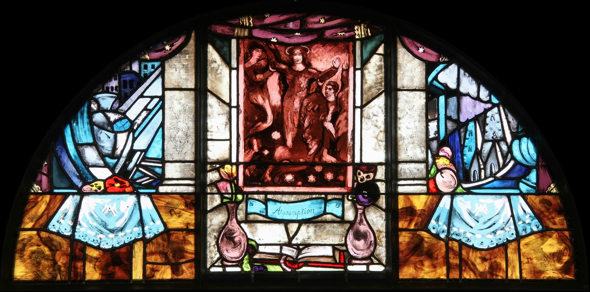 Pour ce cycle de six verrières consacrées à la Vierge, Cingria joue avec les plans et différents niveaux de réalité, pour donner l’impression que la scène figurée au centre est un tableau de retable intégré au sein d’un autel dont l’avant serait situé juste sous les yeux du spectateur. Partiellement recouvert d’un rideau, ce retable est encadré de deux pans de parois traité avec un verre imitant la texture du marbre, tout comme la table d’autel. A l’arrière-plan, l’artiste emporte le regard du spectateur vers des paysages étranges, où différents éléments figuratifs s’entremêlent avec une grande richesse inventive. Contrastant avec le reste du vitrail présentant des verres aux multiples textures et effets, la scène centrale correspondant au retable se compose de peinture à la grisaille et au jaune d’argent sur un fond de verre transparent, traité à la manière d’une peinture.