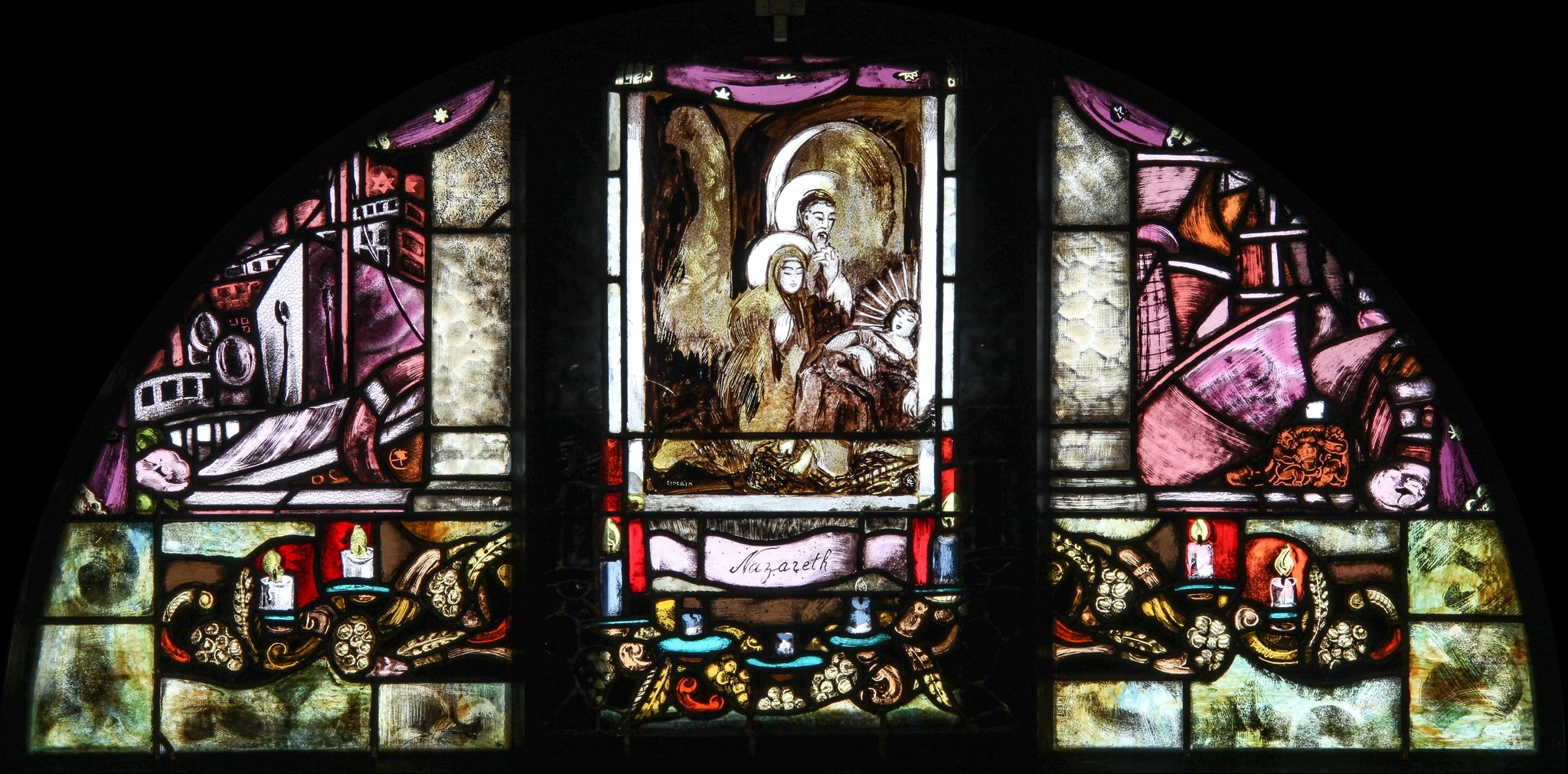 Fenêtre en demi-cercle divisée en trois panneaux comportant une composition unique. Au centre, se trouve une scène figurée représentant la Vierge et Joseph agenouillés, veillant l’enfant Jésus endormi.