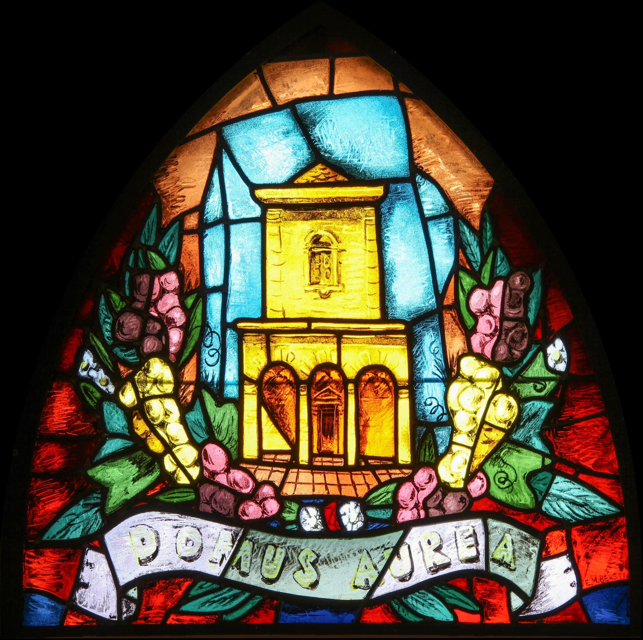 Les vitraux de Beretta déclinent les symboles des litanies de la Vierge, honorant Marie, patronne de la chapelle. L’artiste les a placés au centre de la fenêtre en tiers-point, en les entourant d’éléments ornementaux végétaux, floraux et animaliers, disposés symétriquement de part et d’autre du vitrail, accompagnés d’une banderole nommant le passage des litanies représenté. Ces vitraux ont été conçus par Beretta avant tout comme un accompagnement de son chemin de croix en peinture murale, situé en dessous des fenêtres de la nef. Ils ont pour rôle de retenir la lumière afin de le mettre en valeur sans le concurrencer. Les coloris, notamment les rouges, le jaune-or et le brun, bien que plus vifs, rappellent les tons du chemin de croix, tandis que l’artiste a peint les éléments figuratifs à l’aide d’une peinture à la grisaille apposée avec une touche à la fois vive et précise, qui caractérise également sa peinture. Pour ce vitrail de la Domus Aurea (la Maison d’or), il opte pour des grappes de raisin, probable clin d’oeil au retable du choeur, dont les personnages représentés en-dessous de la Vierge incarnent les activités paysannes de la terre et de la vigne en lien avec les symboles eucharistiques du pain et du vin.