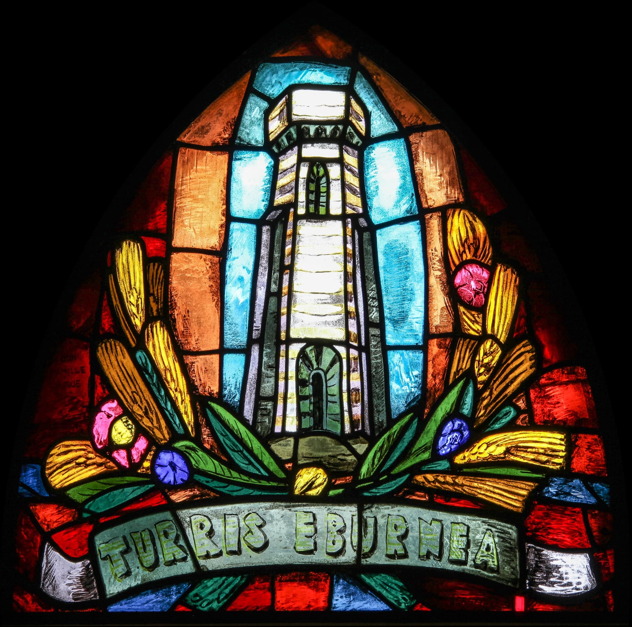 Dans une fenêtre en arc en tiers-point est représentée une tour hexagonale blanche aux parements bicolores, avec des contreforts et percée d’ouvertures en plein cintre, couronnée d’un mâchicoulis. Elle se détache sur un fond bleu clair évoquant le ciel, contrasté sur les côtés par des teintes brunes, orange et rouges. Au premier plan, une banderole comportant l’inscription “TURRIS EBURNEA” se déploie, entourée d’une gerbe d’épis de blé et de fleurs des champs : bleuets, coquelicot et scabieuse.
