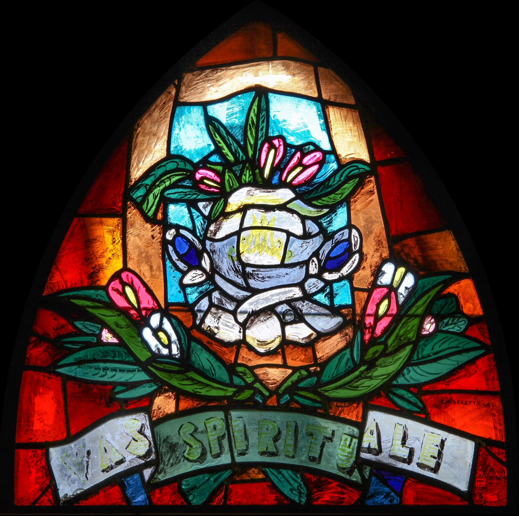 Dans une fenêtre en arc en tiers-point est représenté un vase blanc en porcelaine orné d’un large rebord et au centre du “M” marial, avec un socle et des anses ornées de gemmes bleues. Le vase contient des anthuriums roses et se détache sur un fond bleu clair évoquant le ciel, contrasté sur les côtés par des teintes brunes, rouges et orange. Au premier plan, une banderole comportant l’inscription “VAS SPIRITUALE” se déploie, sous un bouquet d’anthuriums bleus et roses.
