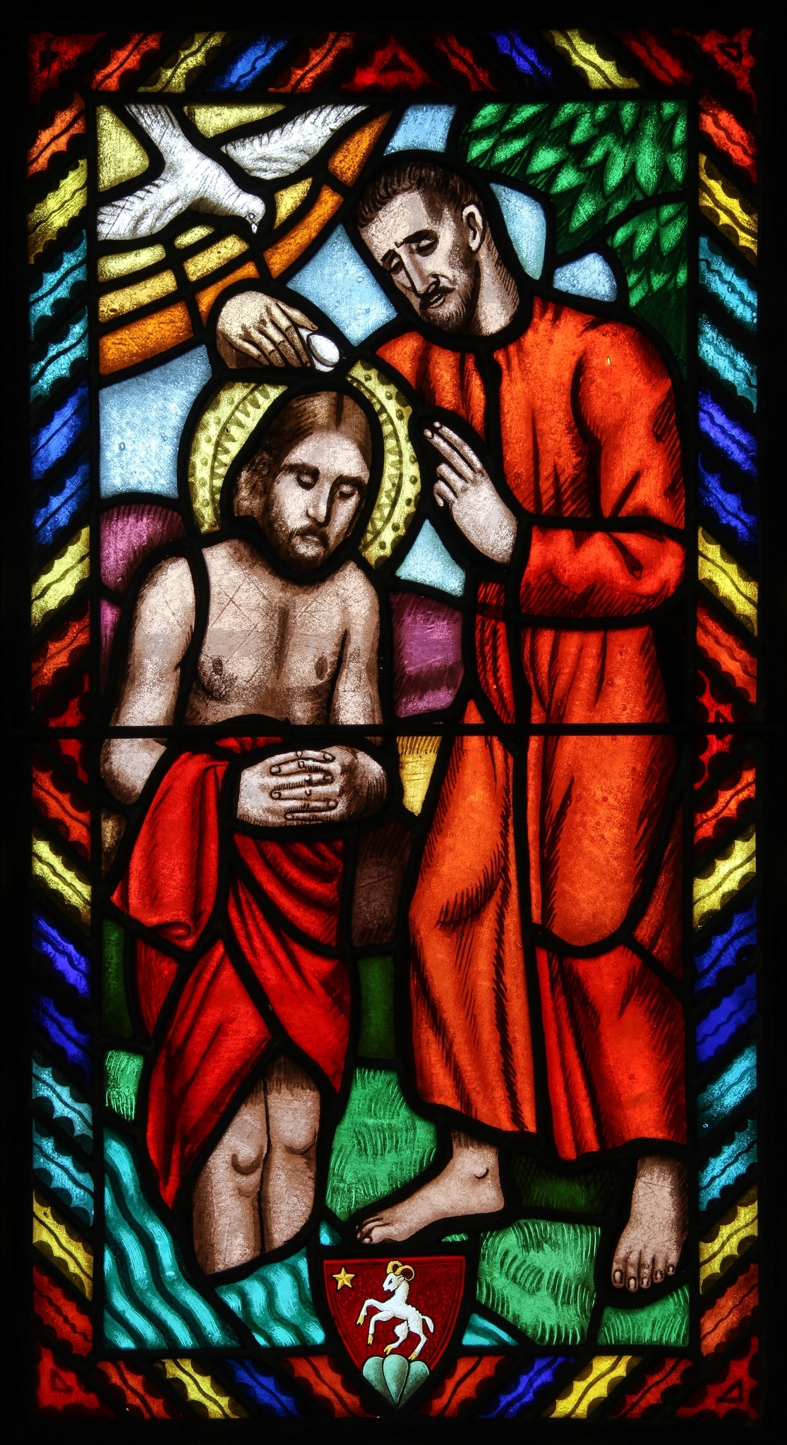 Ce petit vitrail relate l’épisode du baptême du Christ.