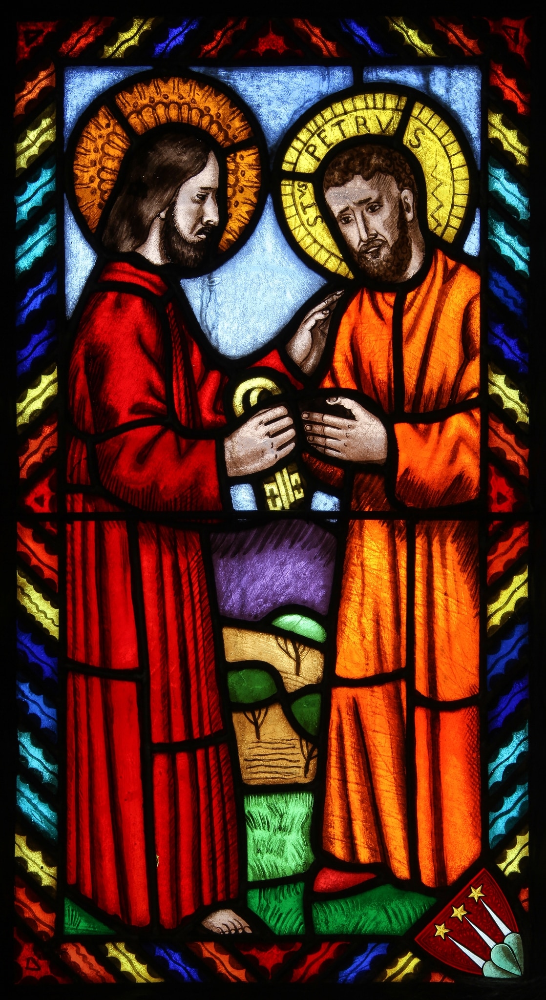 Ce petit vitrail relate l’épisode de la remise des clefs du Royaume des cieux par le Christ à saint Pierre.