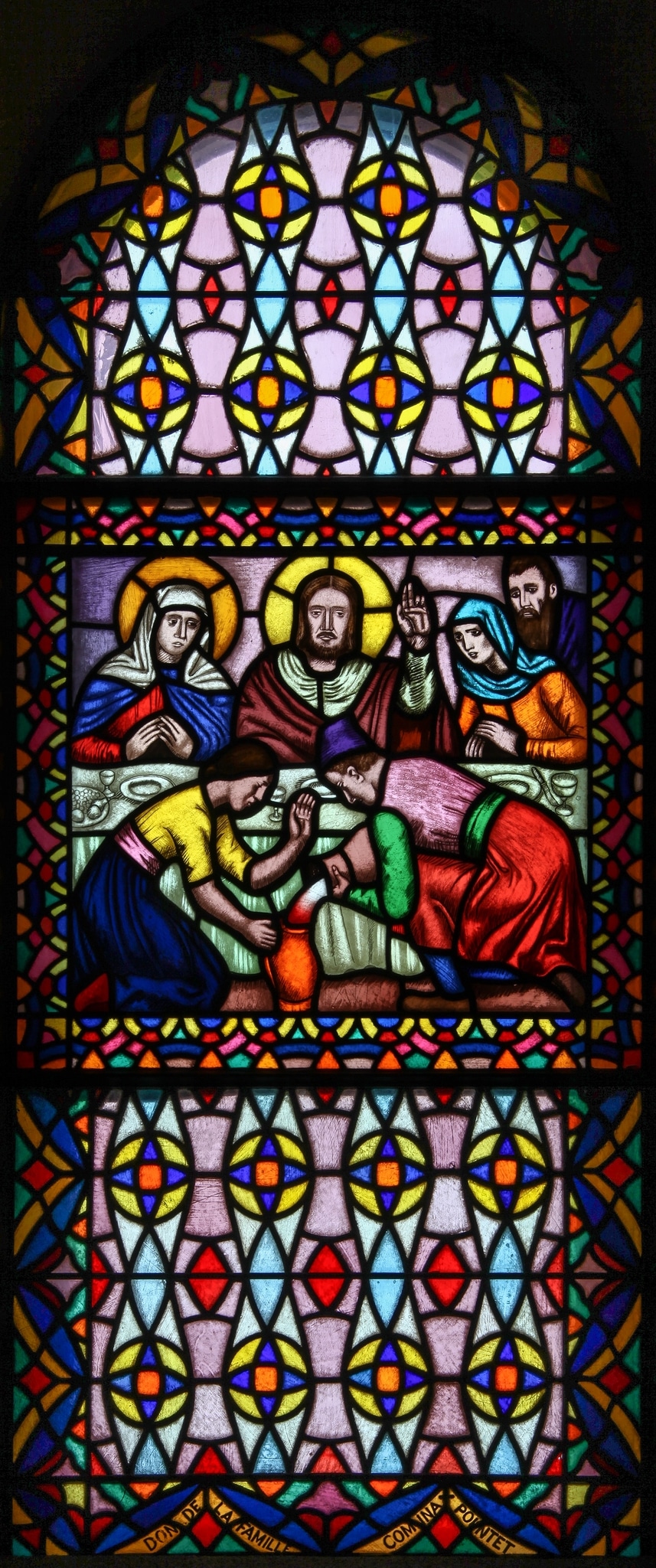 Cette grande verrière mixte conjugue un fond ornemental avec au centre une scène narrative relatant un épisode des noces de Cana.