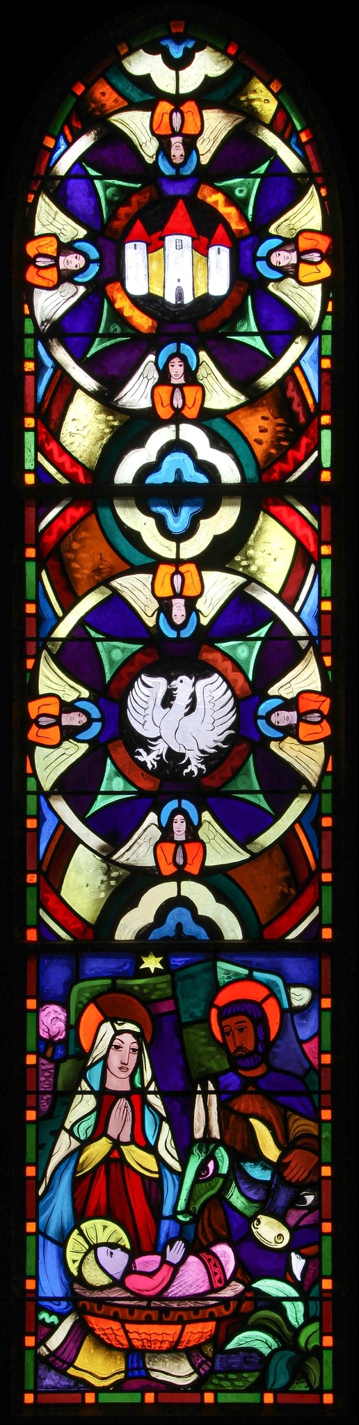 Verrières mixtes composées dans leur partie supérieure de deux médaillons ornementaux superposés au centre desquels sont dépeints des symboles christiques, elles présentent dans leur partie basse des scènes liées à la vie de la Vierge et du Christ illustrant les mystères du Rosaire (Lovy, 2014, p. 4). Thévoz mélange deux types de verrières répandues depuis le Moyen Âge (verrière à médaillons superposés et verrière narrative), dont il propose une version modernisée. Très inventif dans sa composition et le choix de ses motifs ornementaux, il réalise un dessin structuré et rigoureux pour la partie ornementale, adoptant un des motifs floraux utilisé pour la décoration du chœur dont le projet avait été établi par Gaston Faravel (Chassot, 1931b). Pour les scènes narratives, il opte pour un style minimaliste où les protagonistes figurent au centre de la représentation en plan moyen, sans décor superflu.