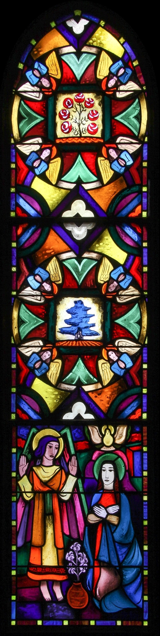 Sauterel, V. (2024). Annonciation (premier mystère joyeux du Rosaire). Dans Vitrosearch. Consulté le 5 décembre 2025 de https://www.vitrosearch.ch/objects/2714872.