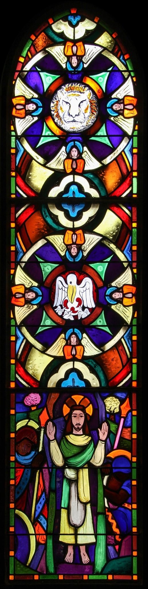 Au centre, est disposé un médaillon constitué d’une fine bordure jaune pâle sur laquelle sont agencés quatre anges en buste, les ailes ouvertes et les mains jointes. En son milieu apparaît un cercle à l’intérieur duquel se trouve un pélican offrant ses entrailles comme nourriture à ses petits.