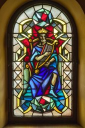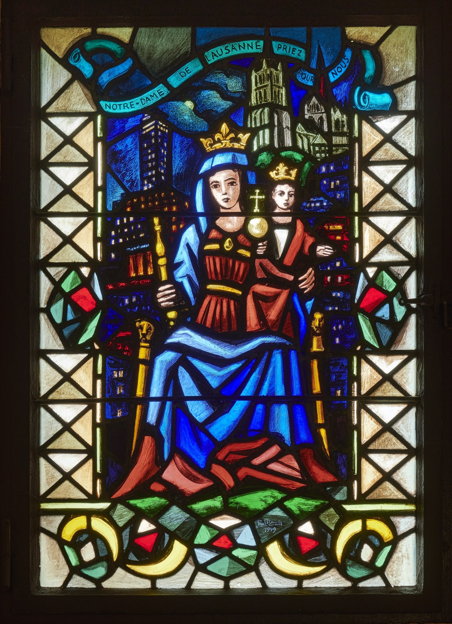 Par rapport aux autres vitraux qui suivent tous un schéma identique avec deux scènes narratives superposées ressortant sur un fond ornemental géométrique composé de verres pâles, ce vitrail constitue une exception. Coupé en deux par la tribune, Monnier ne peut créer d’unité visuelle entre les parties inférieure et supérieure. Il opte donc pour un autre type de composition, faisant tout de même visuellement le lien avec le reste des vitraux de la nef par la présence d’une bordure similaire, ornée de motifs de pierres précieuses. En haut, il représente le Roi David et, en bas, la statue de la Vierge qui se trouve à l’église Notre-Dame de Lausanne.