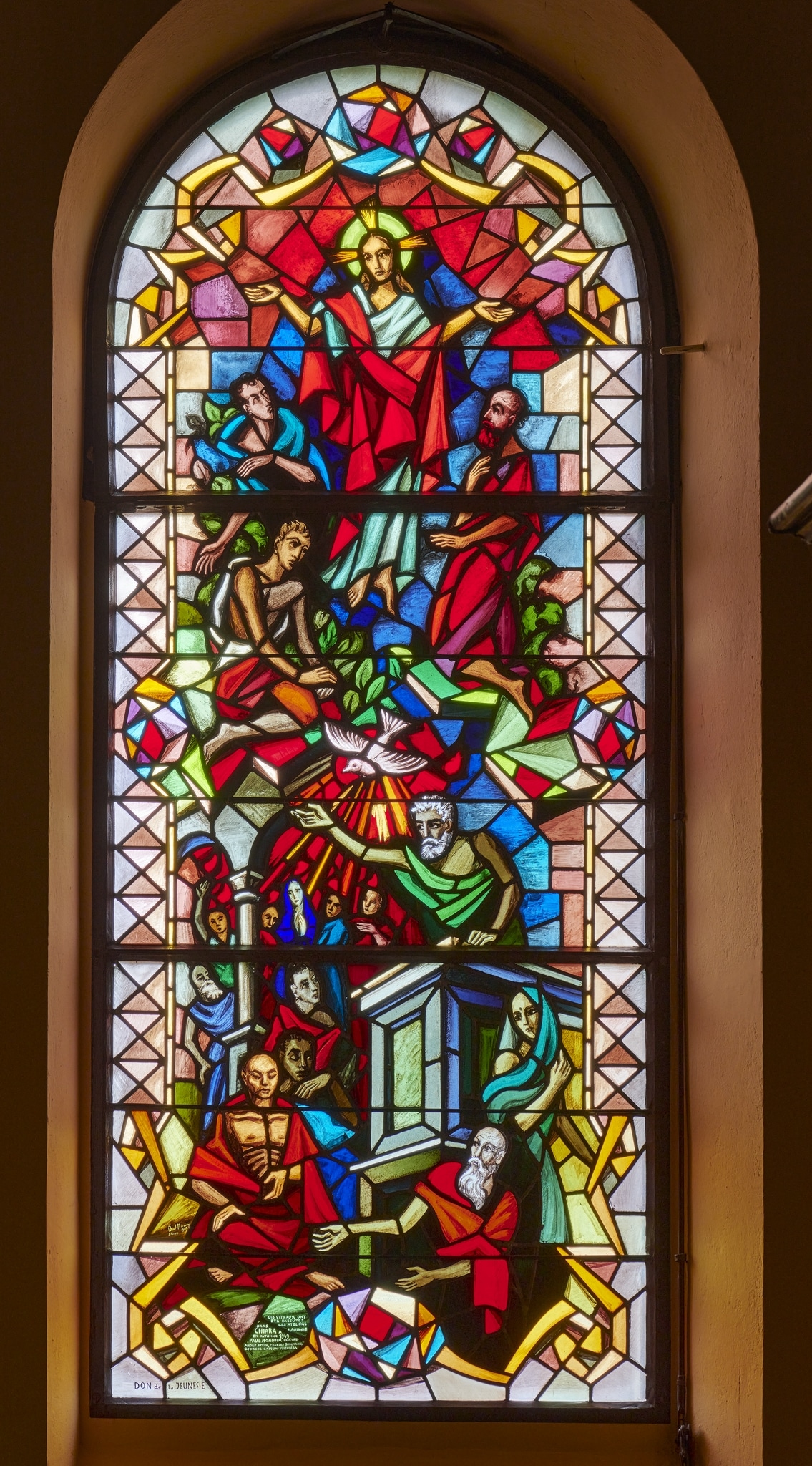 Ce vitrail a été réalisé en 1949 par l’artiste Paul Monnier et l’atelier Chiara de Lausanne, pour la nef de l’église de Villars-le-Terroir.