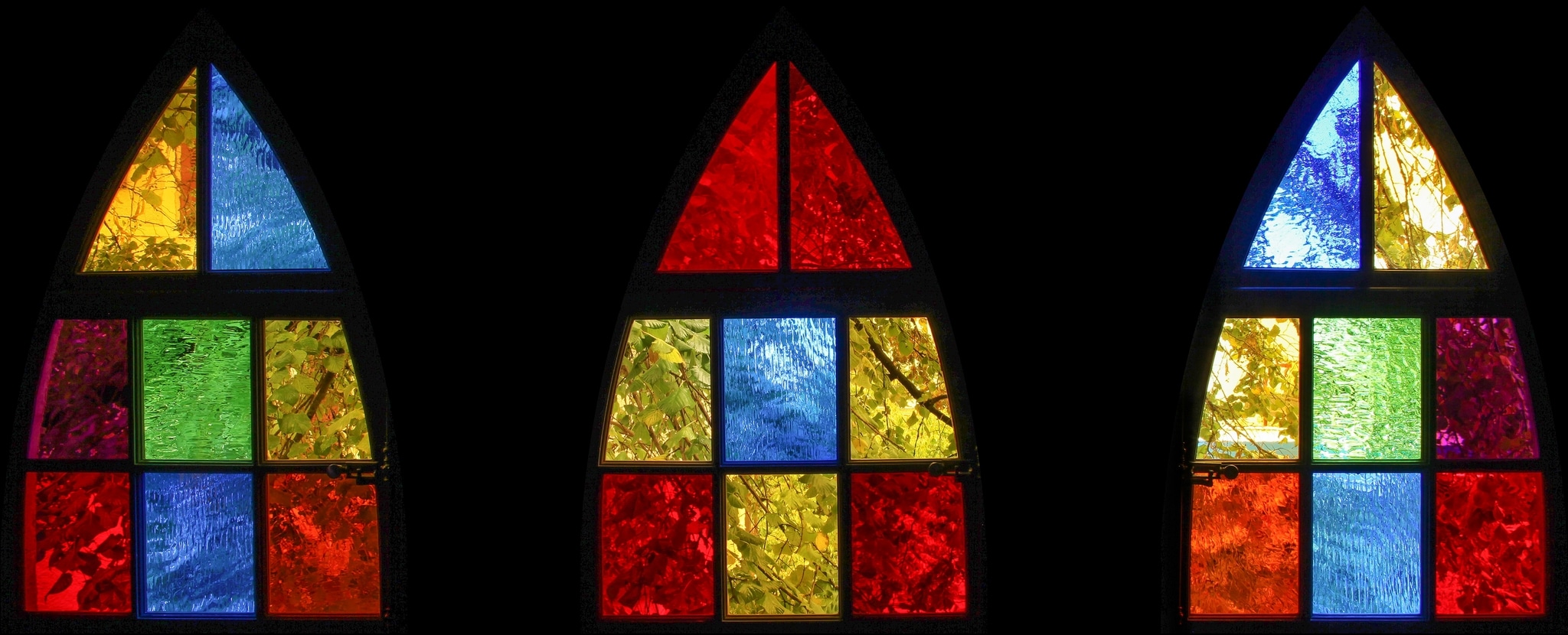 Ces trois fenêtres sont constituées de verres de différentes couleurs sur trois niveaux. Alors que les deux verrières externes sont composées des mêmes verres colorés (bleu, jaune, vert, orange, rouge et violet) selon une symétrie en miroir, celle du centre est constituée de verres rouges et jaunes sur les bords et d’une pièce bleue au centre.